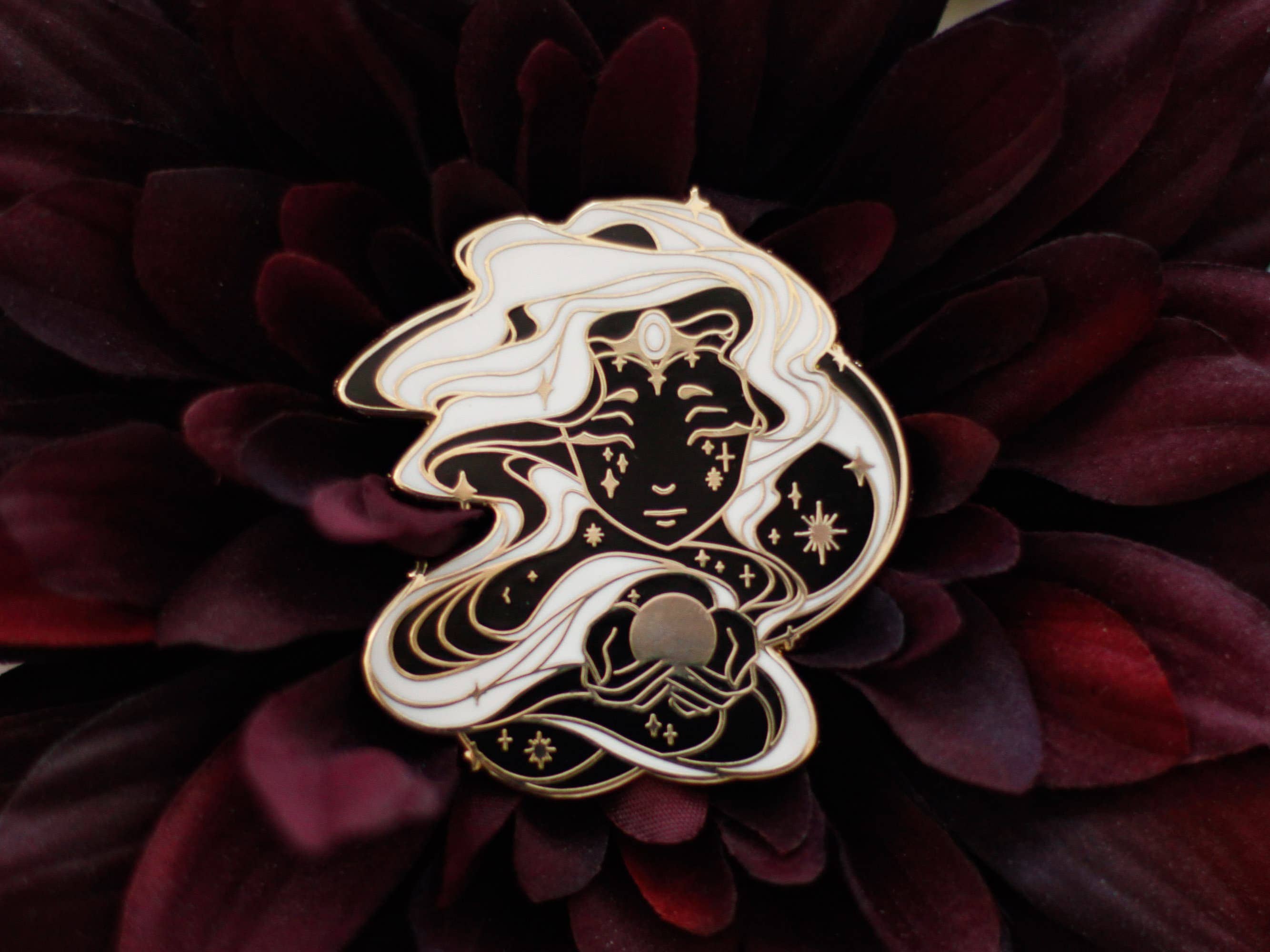 Five years ago I started this business with my first pin, Windowsill Cat, which is still one of my favorites. I had never really heard about pins before but once I found out about them I became obsessed. I just love that I can create tiny illustrations that others can take with them or display on their wall. I also loved that I could use gold metal as part of the design element since I've always had an interest in jewelry. In the beginning I described my pins as "myth, magic and mood inspired", which they still are today, though I have gone into more of a storytelling and worldbuilding kind of approach to my designs, releasing themed sets and writing little snippets of lore, even dabbling in named characters like Edgar the raven. It has been a challenging but fun journey and I'm excited to continue bringing my whimsical fantasy visions to life!