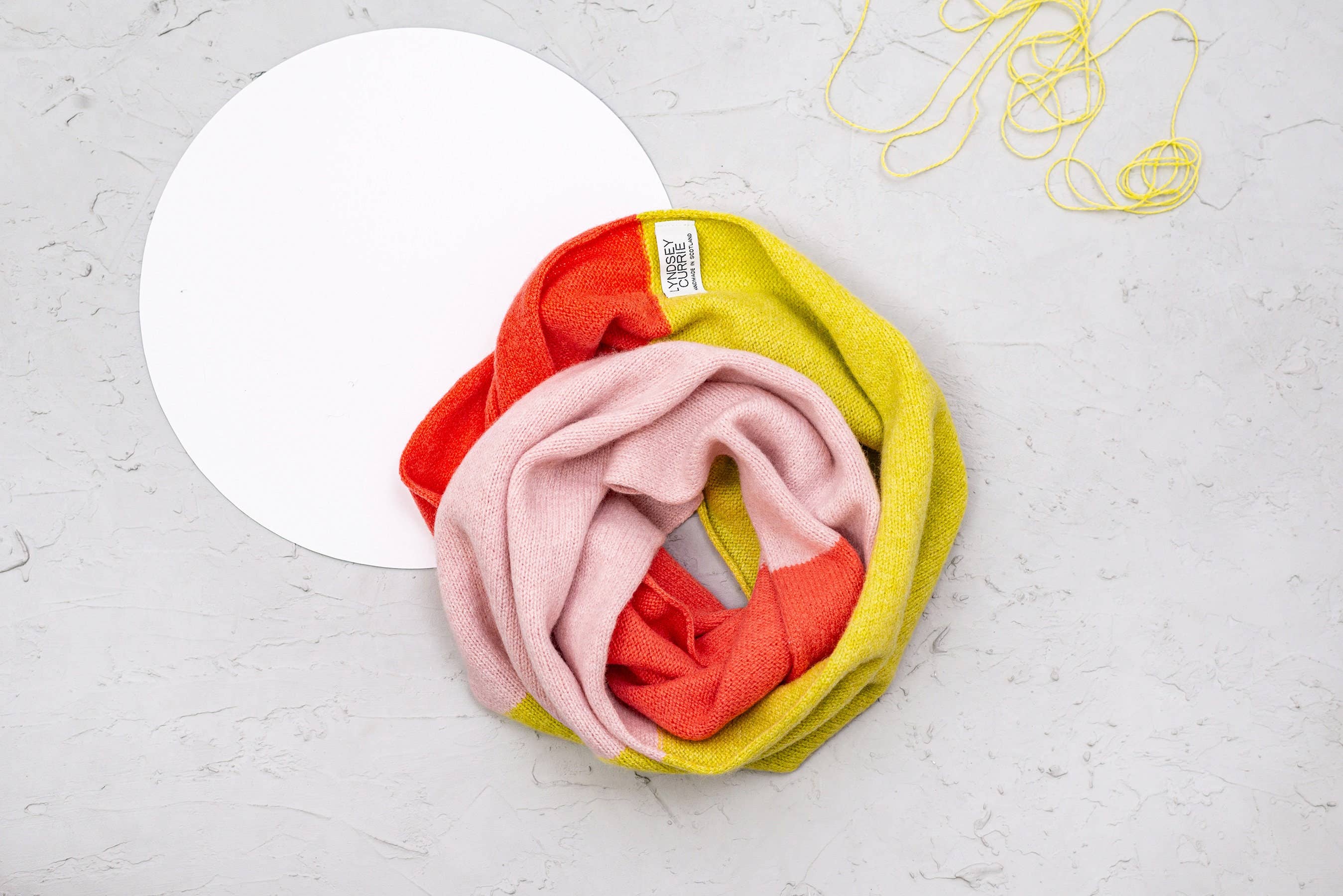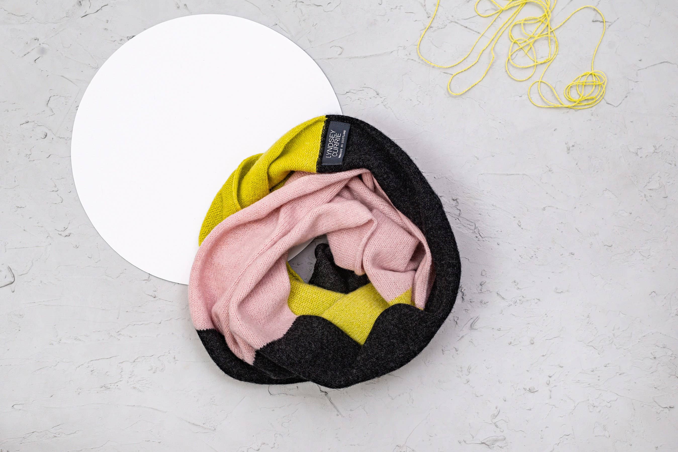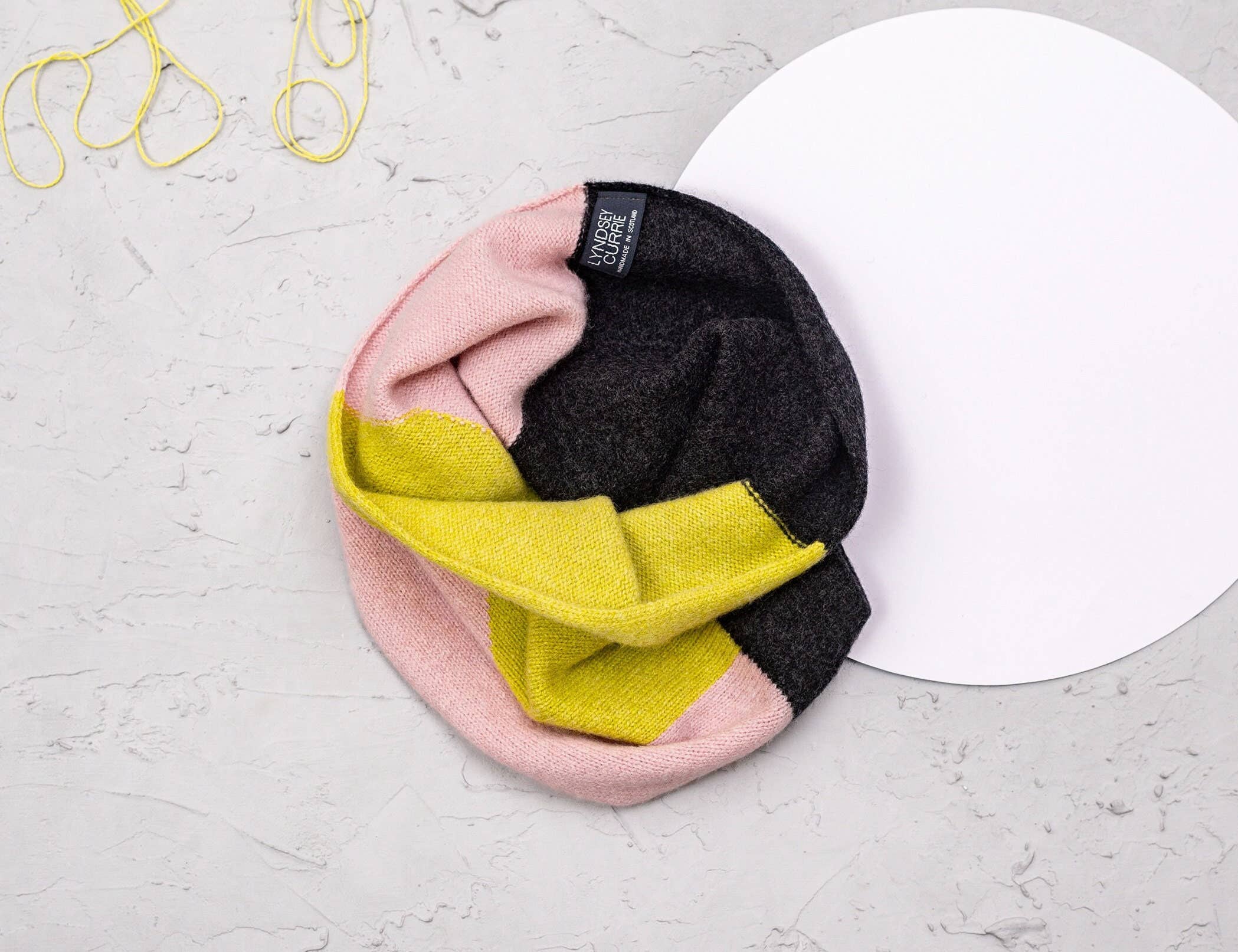 Hi, I'm Lyndsey! Edinburgh born, I moved to Dundee to study textiles at Duncan Of Jordanstone College of Art and Design, specialising in Knitting. After graduating I went on to become Designer in Residence at the University, which meant I could use the facilities and help in the classes teaching others to knit. I was then given the opportunity to work at the university as the Knit and Stitch technician covering a 6-month sabbatical leave. After a fabulous 6 months of teaching I decided it was time to go self-employed! Since graduating university, it was dream too start up my own business! A little bit about my work I have always been extremely interested in Brutalist architecture and love to pair bright and bold colours with architectural shapes. All my products are designed and made by myself in Dundee, Scotland, on a hand-powered knit machine! All my knitted products are made from 100% premium lambswool which is spun and dyed in Scotland using environmentally friendly dyes.