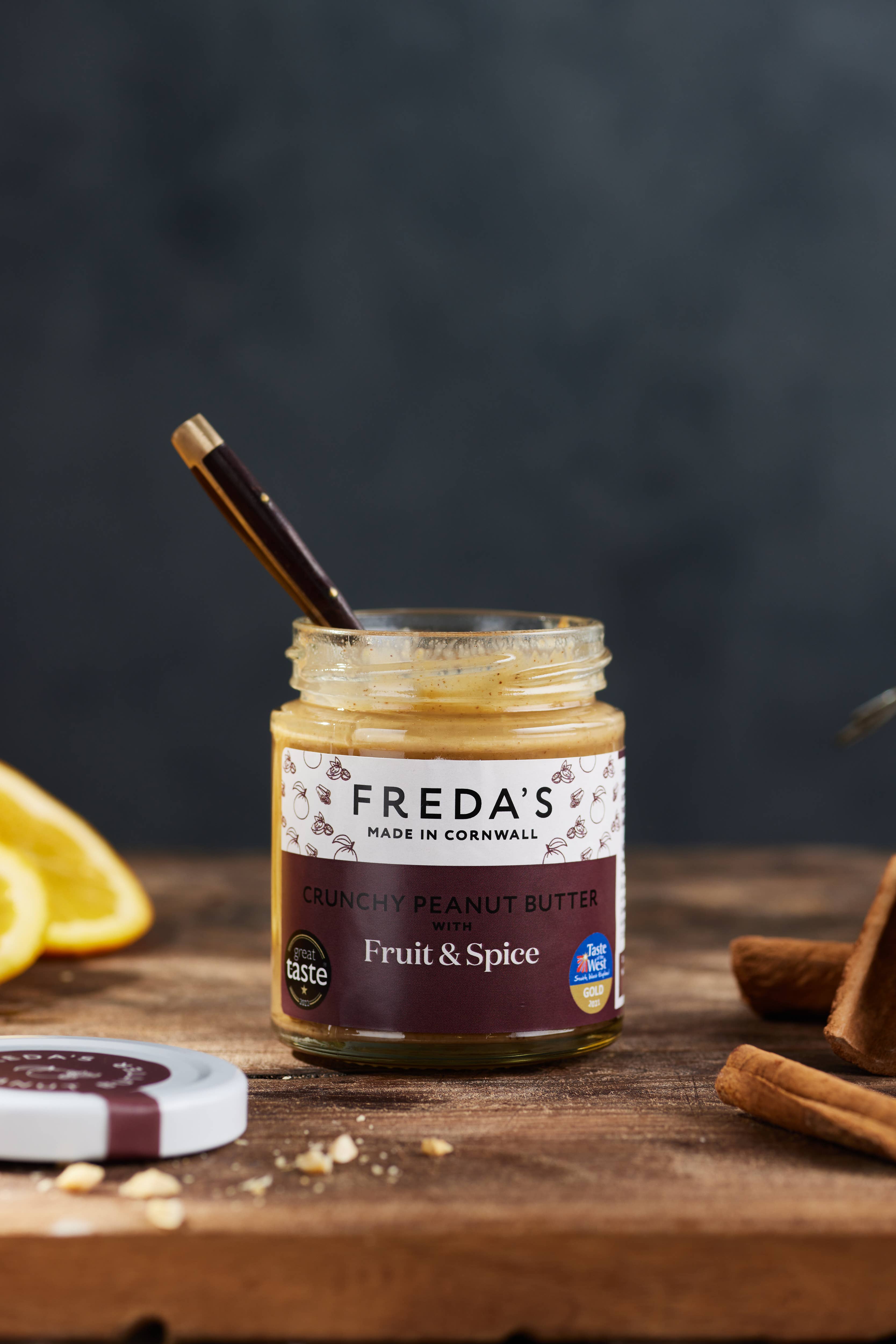 In 2016, Lisa and Andrew Newsham embarked on the holiday of a life time touring around New Zealand in a camper van called Freda. Little did they know that it would literally be a life changing trip. As peanut butter lovers they searched for a couple of artisan brands on the shop shelves of New Zealand and were impressed that there seemed to be a revival of great quality nut butters there that were a million miles from the palm oil and refined sugar loaded offerings to be found in UK supermarkets. This sowed the seed of an idea to produce their own, but rather than it being plain peanut, they decided to incorporate interesting flavours from around the globe. After a year of trial and error, Freda’s was launched in 2017 with 5 tasty flavours. And from the early days of making Freda’s in the kitchen at home, it is still made by Lisa and Andrew but now in the spacious surrounds of the Duchy College in East Cornwall. Now to be found in independent stores across Cornwall and South Devon (plus a few further afield) Freda’s has gone from strength to strength winning coveted awards from Taste of the West and Guild of Fine Food.