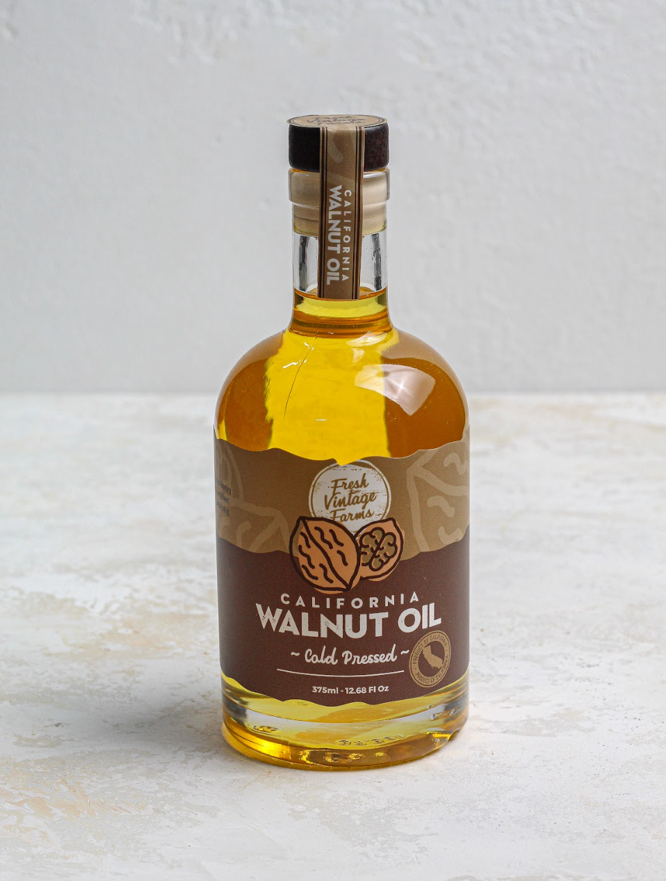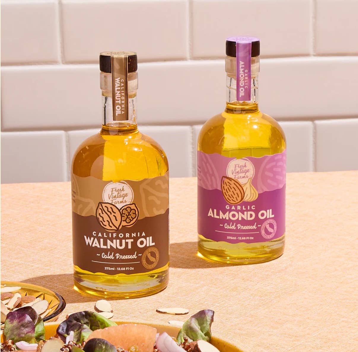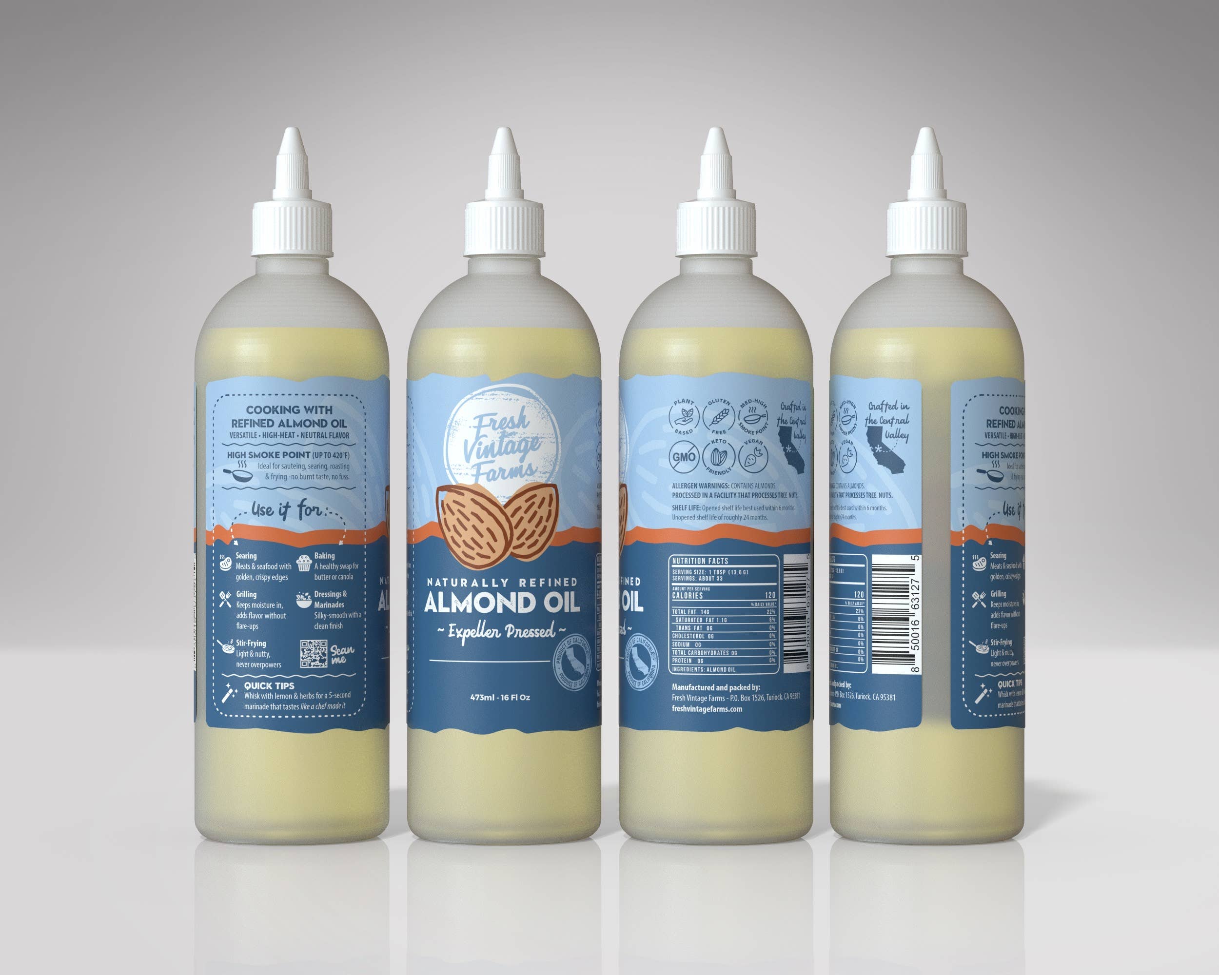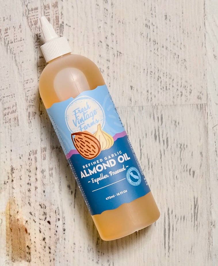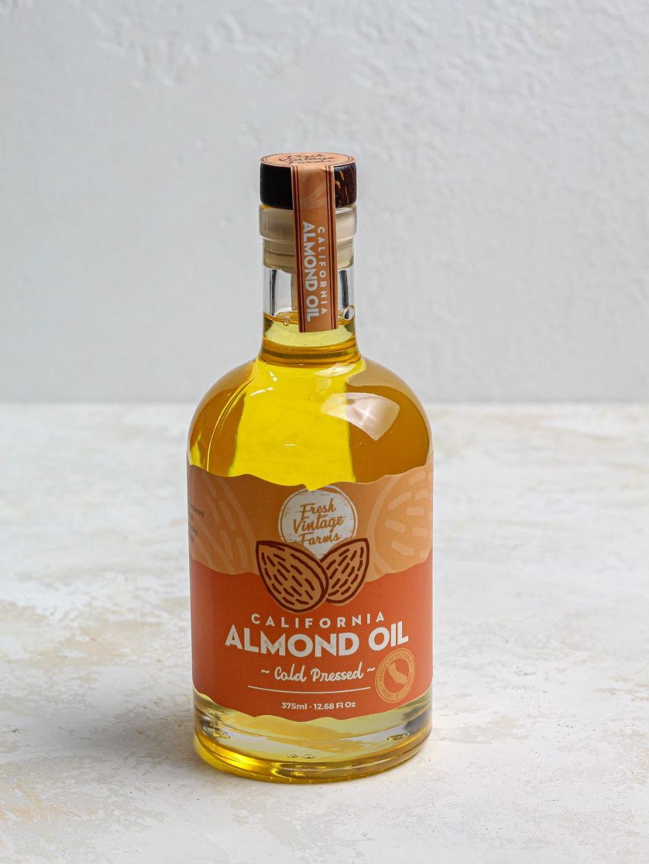 About Us: Our artisan cooking oils are crafted locally in the Central Valley of California. Through partnerships with farmers we know to be good stewards of the land and environment, we are able to deliver authentic, sustainable, and delicious cooking oils. We take pride in our cooking oils - use only whole, edible nuts in our small batch manufacturing process - and cold press extraction to guarantee an exceptional taste while still providing maximum nutritional value. Our Farming Roots Run Deep Fresh Vintage Farms was founded in 2019 by husband and wife Tommy and Tara Tickenoff. As third generation almond farmers, their connection to farmers and sustainable farming practices led them to create Fresh Vintage Farms. Crafted in California Originally born out of Turlock, CA - Fresh Vintage Farms is truly a company focused on keeping everything as close to home as possible. The tree nuts used in our Artisan Cooking Oils are grown in a 90 mile radius of Turlock, Ca.