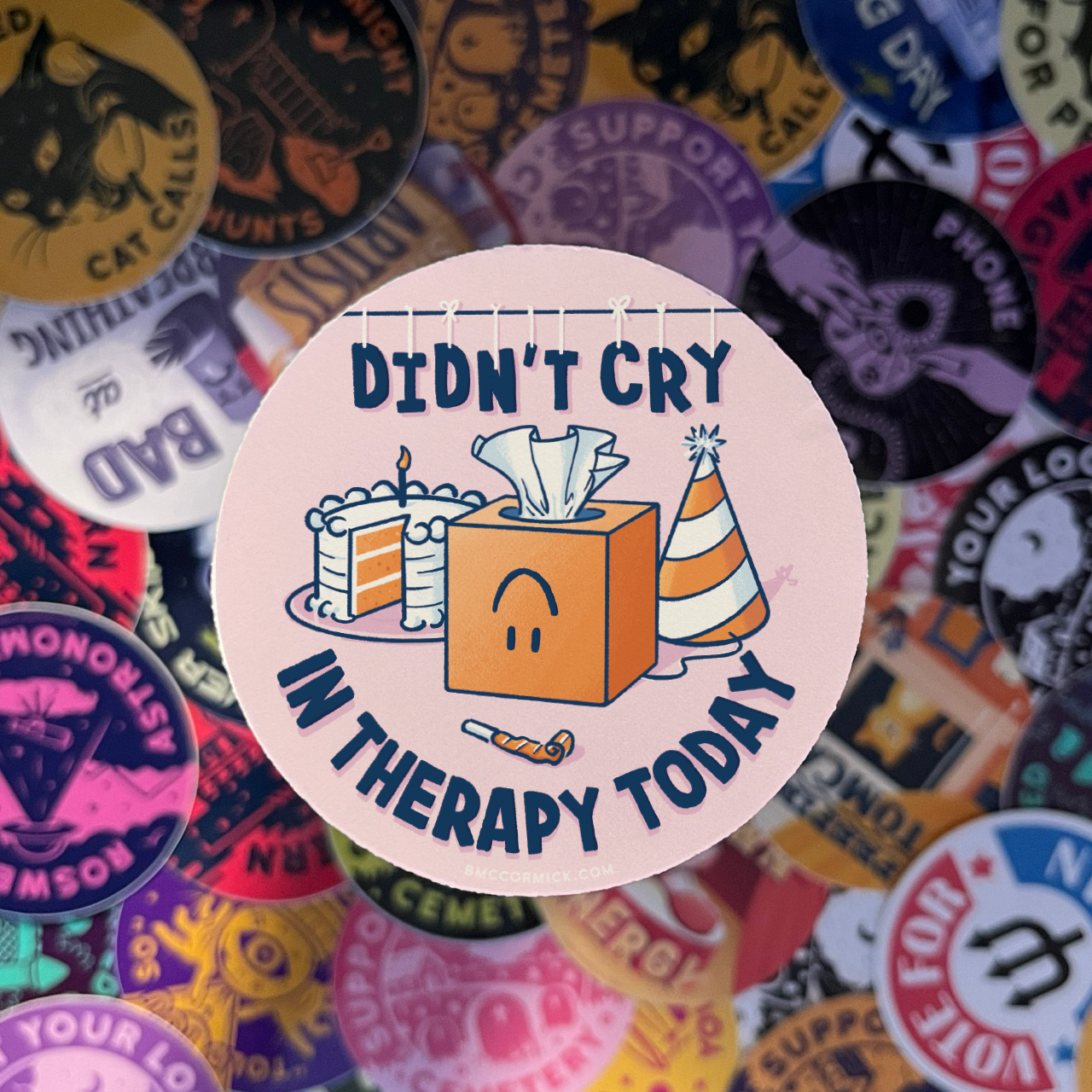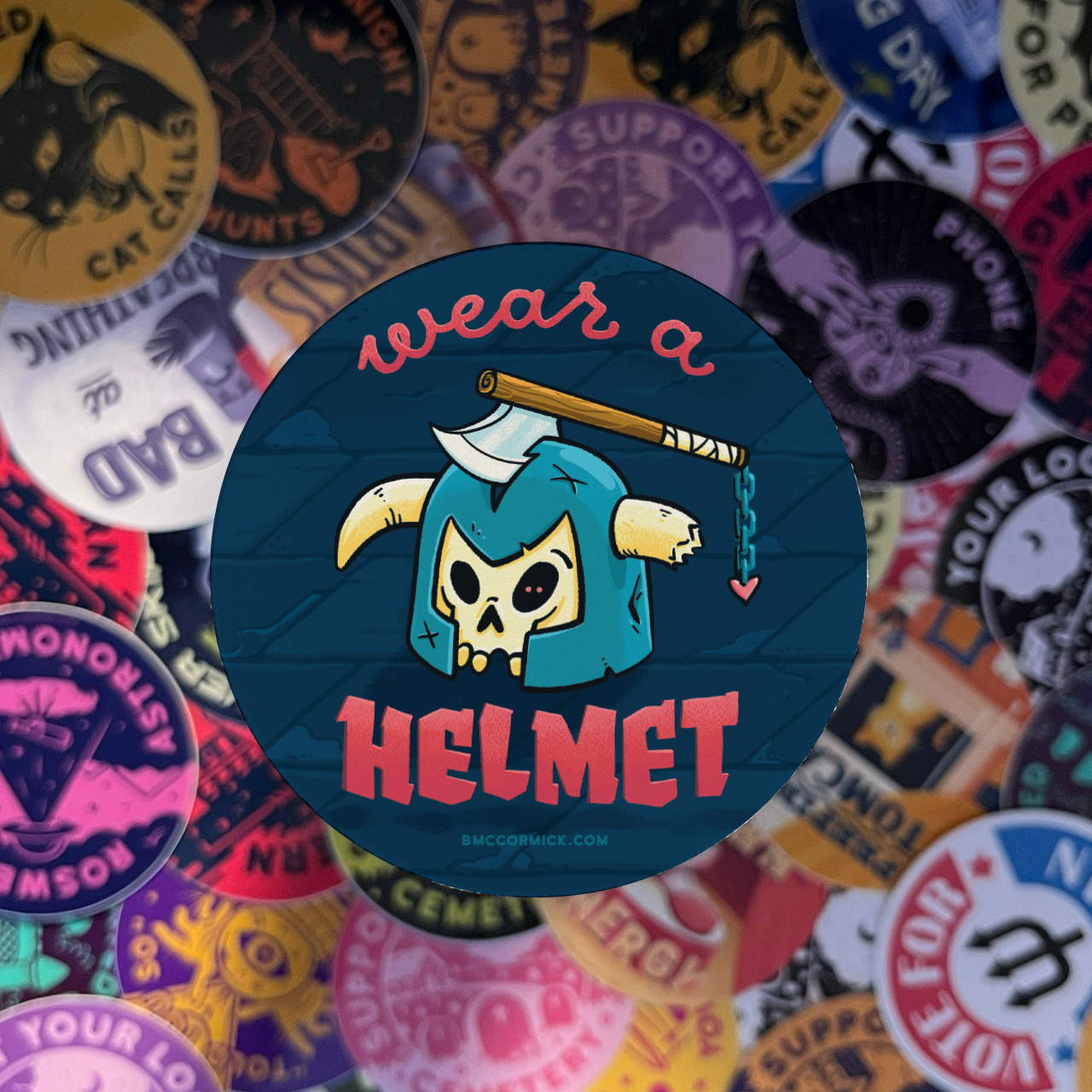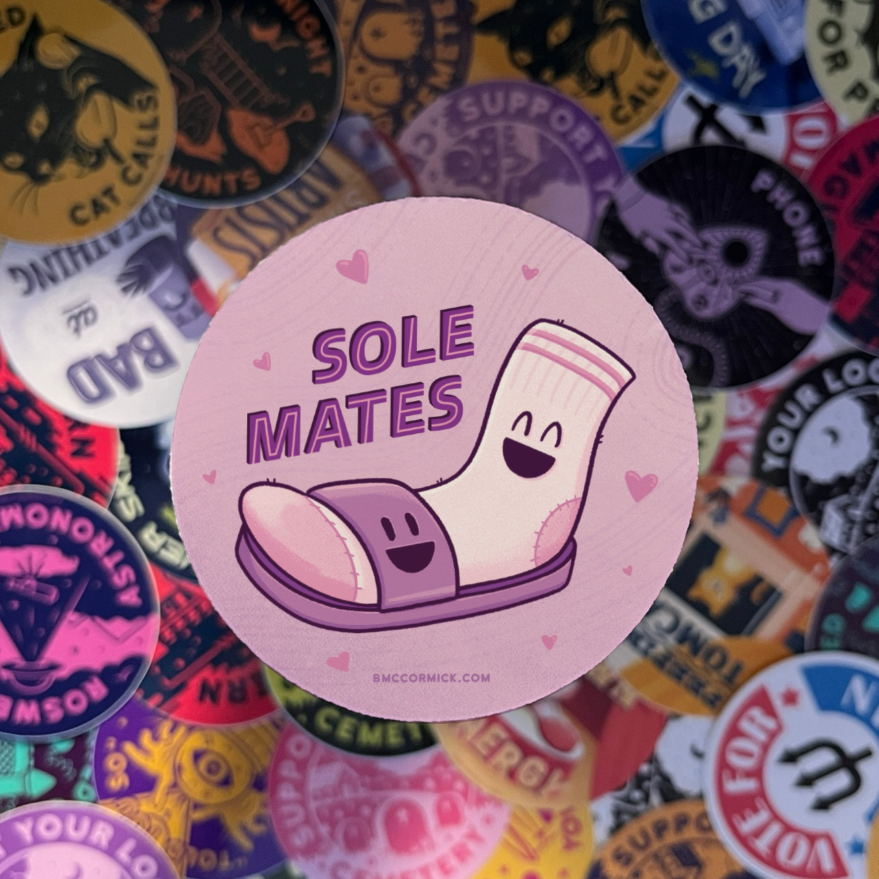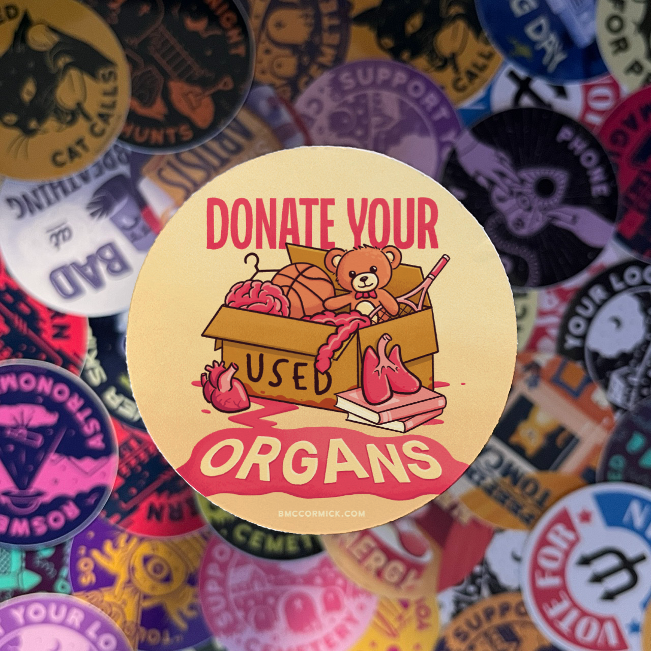 BMcCormick Art is a husband and wife team that was created in 2020 by B. He is is a talented digital artist who enjoys creating colorful, funny, off-kilter merchandise. He draws heavily from being a child of the 90s, being inspired by skate culture, cartoons, video games, and goofy and macabre humor. His wife, K, joined the business in 2023. She brings nearly a decade of business experience to BMcCormick Art and assists in production, e-commerce, and customer service.