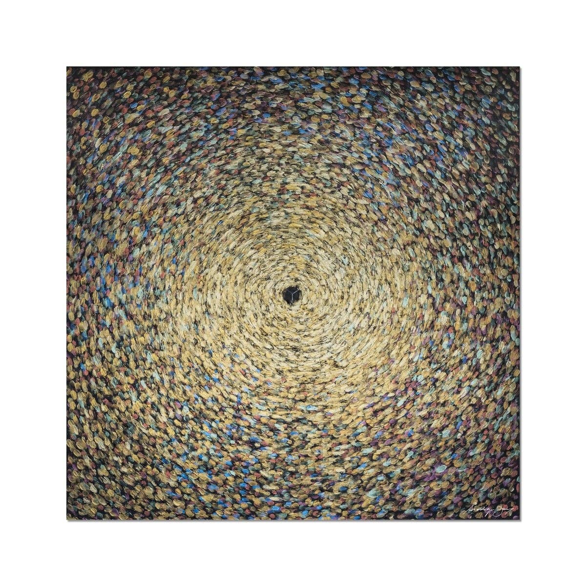 Guided by the Qur’an and Islamic tradition, I create art that celebrates a rich religious and cultural heritage. The first piece of art I can remember making was of a local lady near my childhood home in Dar-es-Salaam, carrying a basket of fruit on her head. It was printed in a local paper, and at the tender age of eight years old, it felt like my path in life was set. It is not just the content of my work that reveals my beliefs: the processes by which my work is created has as much a story to tell. My pieces are characterised by successive layers of vivid colour and intricate repetitive patterns and calligraphy, which draw to mind the ancient illuminated Qur’ans now proudly housed in museums around the world. The vibrancy of my paintings is an aesthetic choice that speaks to the joy that my faith gives me. When I painstakingly cover a canvas with God’s name, it is my personal tasbih, or incantation. Creating these pieces is an act of devotion in itself, a stand-in for meditation, in which each occurrence of a word is like a small offering to God.