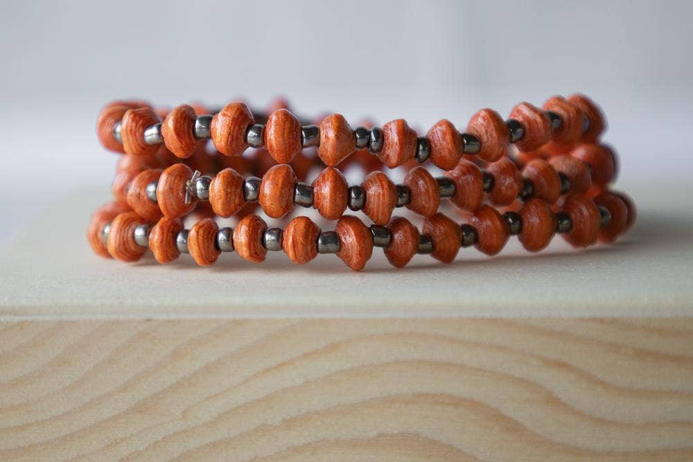 The perfect statement piece to dress up your favorite jeans and t-shirt. Each paper bead is hand-rolled by vulnerable women in Uganda and paired with a small clear bead creating a simple piece that is simple and chic. Every time you look at your bracelet, you will feel a sense of pride knowing that you help fight poverty for single moms and widows in Uganda.