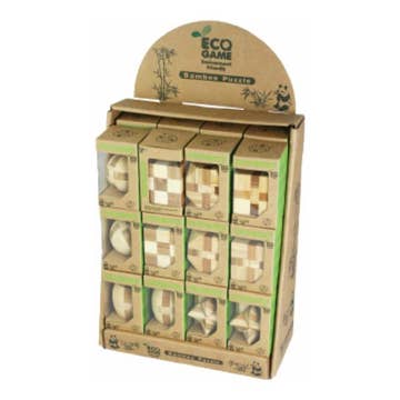 Bamboo puzzles small - complex - display set. Set include an easy to assemble carton counter display and six different puzzle designs; ball, cube, star, barrel, checkers and octagon, four pieces each, for a total of 24 small puzzles. Well-crafted, all natural, bamboo brain puzzles that make an ideal desktop challenge for even the brightest of minds. Bamboo is a large, evergreen plant and member of the grass family. It is also one of the fastest-growing plants in the world, which makes it a plentiful, highly sustainable, eco-friendly product with a wide range of uses. Thus, due to its environmental versatility and unusual compressive strength, it is naturally suited for crafting our handsome, brain buster puzzles, producing an ideal desktop game for home or office. Number of puzzles in the set: 24. Puzzle size: 1" 3/4 aprox.