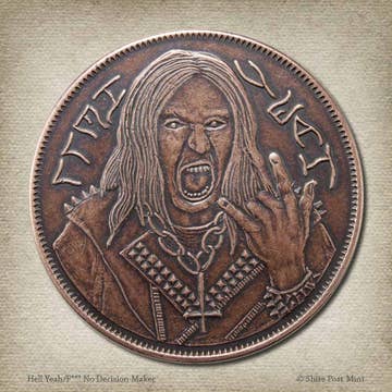 Yes or No? Why Bother Deciding? Metalheads are the hardest people to shop for, because all they really need is METAL. This coin will help your fellow metalhead make clear and crisp decisions. Who wants to be bothered to make decisions anyway! Now with just a flip, wasting time making decisions can now be replaced with more METAL! This Hell Yeah/F*** No Decision Maker is struck from solid copper, measures 3.5 cm in diameter, and weighs about 18.8 grams. Coin artwork by Michael Shantz and Woody Maringer. The product is treated to look as if it has been handled and circulated. This process is done by hand, and it is both an art and a science, coloring and patinas will vary. No two are exactly the same! Coins are struck one at a time in the USA using antique machinery and traditional coining techniques. A colorful description is included with the coin. © Shire Post Mint. All rights reserved. **SAMPLE COIN HAS HOLE**