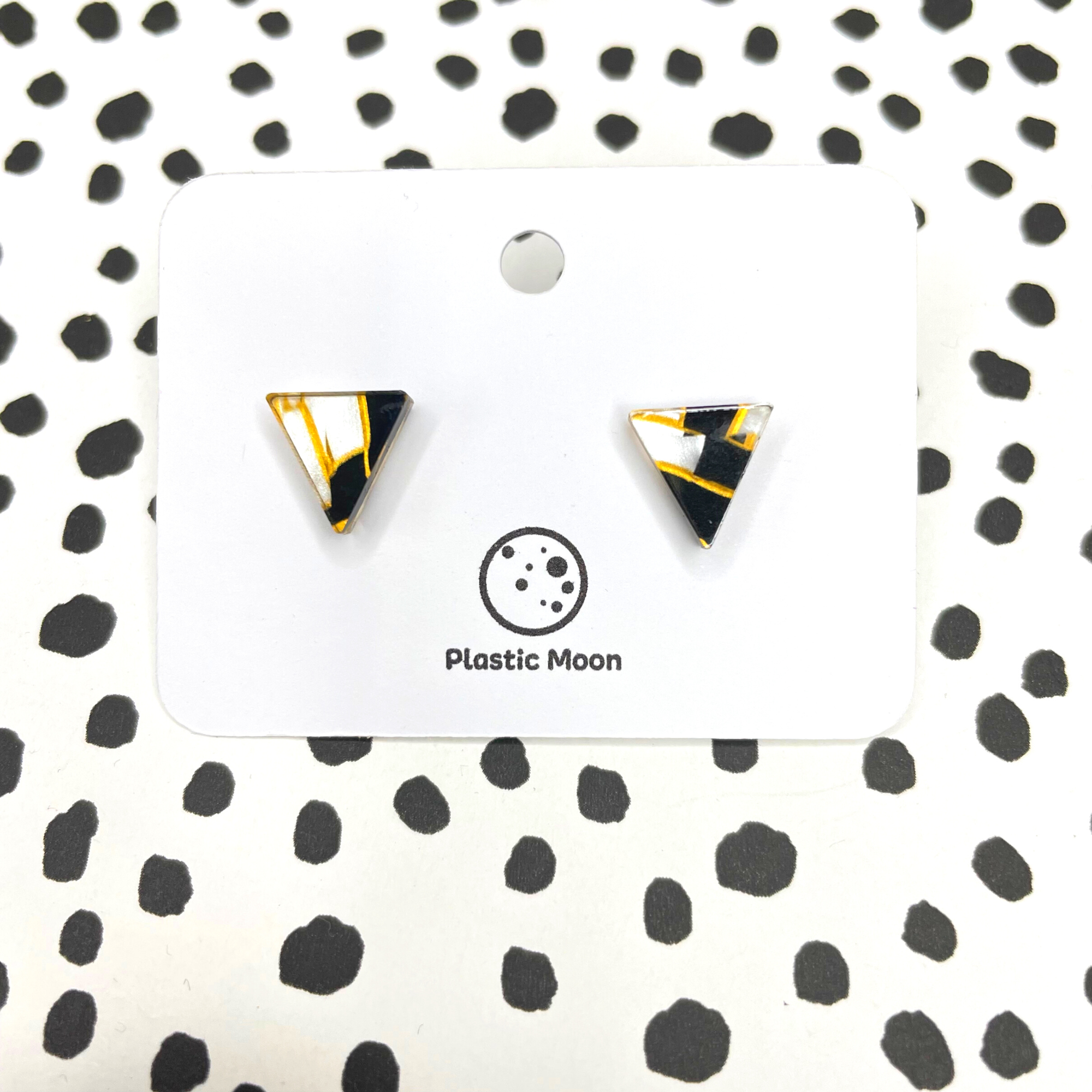 Marbled tortoise with black subtle striping in a great stud shape . These bullet casing-shaped earrings measure approximately 12mmx14mm - just big enough to be classic & go with everything, but they'll get noticed. Earrings are made with vintage lucite parts that were made in Rhode Island in the 1960's - early 80's by Best Plastics. We hand-set them with surgical steel earring posts and they have sturdy surgical steel/acrylic backings on them as well. Light-weight & fun to wear.