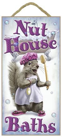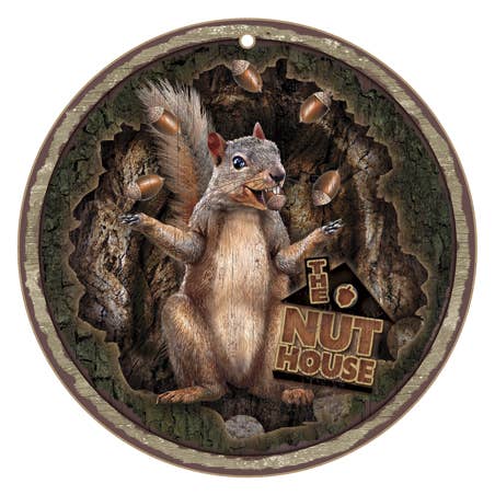 The Nut House (squirrel throwing nuts) on 10" round wood plaque, sign from JQ Licensing