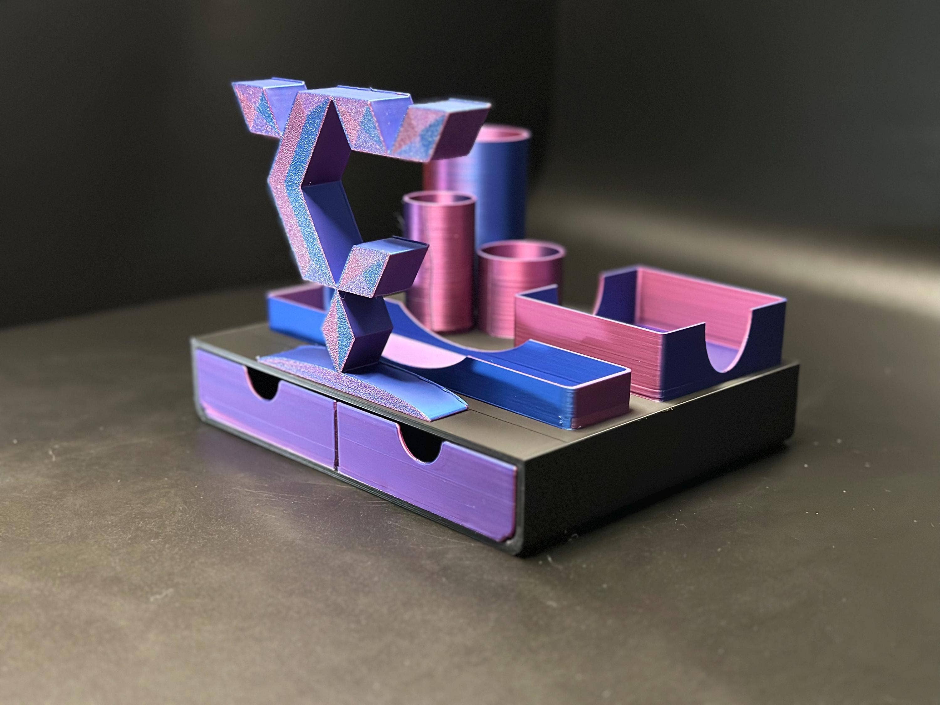 Sleek Black & Grey Desk Organizer – Personalized Touch! Bring bold elegance to your workspace with this black and grey desk organizer. Perfect for creating a stylish and organized desk, it features a customizable name or text tag to make it stand out. A must-have for professionals and students alike! Whether it’s for your office, study, or as a thoughtful gift, this organizer brings charm and practicality together in one beautifully designed piece. Why You’ll Love It: Customizable Name/Tag: Personalize it with your name, favorite quote, or any text (up to 15 characters). Thoughtfully Designed: Includes spaces for Post-It notes, pens, pencils, and other desk essentials. Eco-Friendly Materials: Made with sustainable, plant-based plastic that’s durable and environmentally friendly. Perfect Gift Idea: Ideal for holidays, birthdays, or anyone who loves personalized decor. Functional Layout: • Post-It Note Holder: Keeps your sticky notes handy. • Pen/Pencil Slot: Perfect for markers, pens, or brushes. • Three Multi-Use Tubes: Organize small office tools, scissors, or even makeup brushes. • Two Drawers: Store paper clips, staples, or other small items. Dimensions (W x D x H): • Base: 7.6” x 6.3” x 1.4” (19.2 cm x 16 cm x 3.5 cm) • Drawers: 3.6” x 6.2” x 1.1” (9.2 cm x 15.7 cm x 2.8 cm each) • Whole unit: 7.6” x 6.3” x 4.3” (19.2 cm x 16 cm x 11 cm) How to Customize: When checking out, leave a note with the text or name you’d like on your organizer (up to 18 characters). Add a touch of personality to your workspace or surprise someone with a thoughtful, customized gift! Quality While 3D printing may result in minor surface variations, each lamp is meticulously inspected to ensure the highest quality before it reaches your door. We take pride in our craftsmanship and pay attention to every detail to make sure you'll love your new lamp. Care Instructions • Cleaning: Use a soft, dry cloth to gently clean. Avoid using hot water or chemicals. • Placement: Indoor use only. Manufactured by: Studio Skaug, Address: Postbox 420, 2051 Jessheim, Norway, Electronic Address: contact@lt3studio.com, Company Registration 934208900. EU Responsible person (for authorities only): eucomply OÜ Pärnu mnt 139b-14 11317 Tallinn, Estonia hello@eucompliancepartner.com +33757690241.