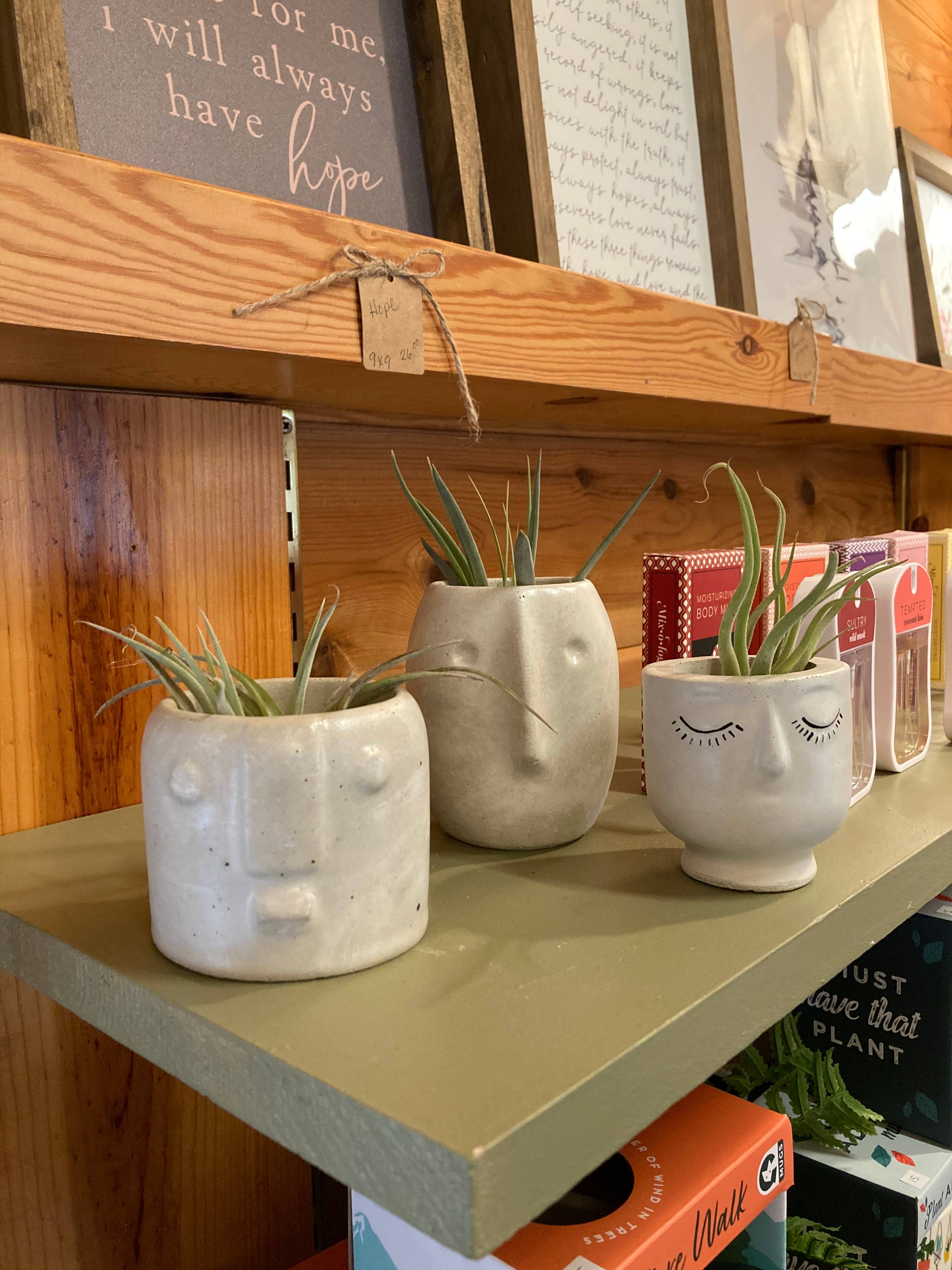 Customers love that the face pots have names! Roger, Charles and Anne have sold well in the shop! Definitely a conversation piece amongst friends shopping together 😊 Looks great with air plants and succulents!