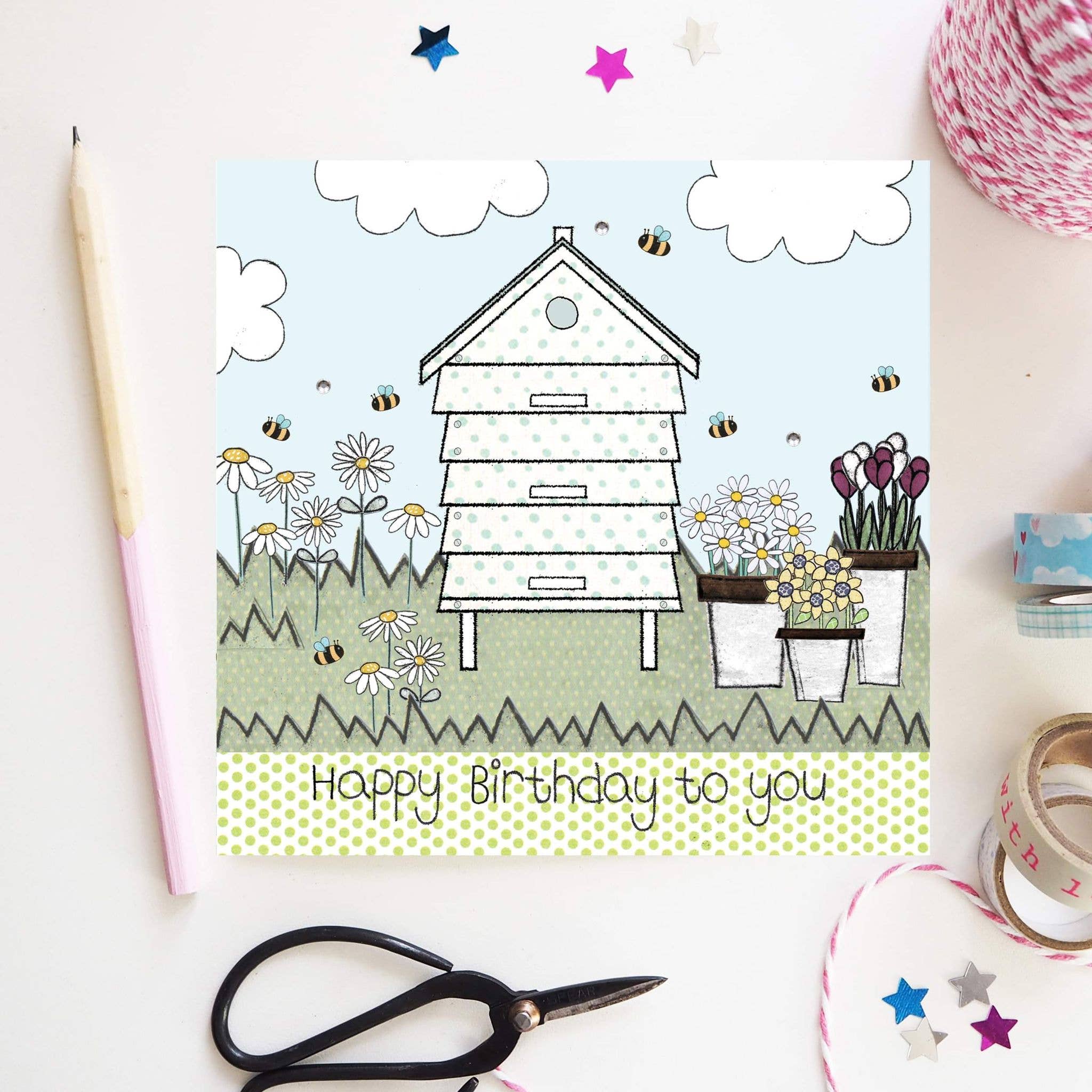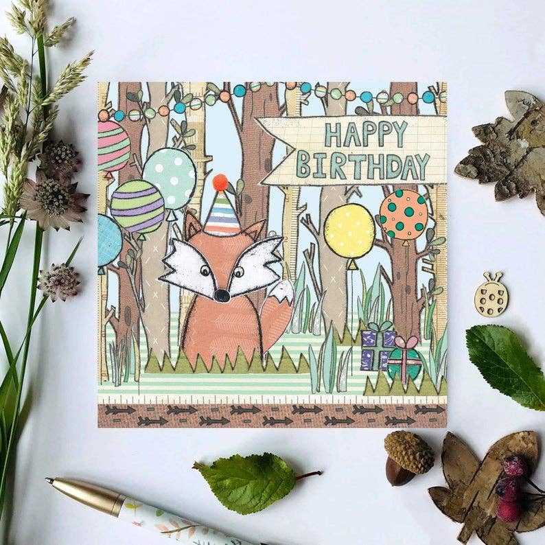Each card has been hand illustrated by flossy using mono-printing and collage, before sending to print. All our cards are designed in our studio in Derbyshire and are printed in the UK. Every card comes with a kraft brown envelope which has an illustrated address sticker attached and are individually wrapped in a biodegradable cellophane bag. We have hand attached paper flowers and gems to the cards for that extra special touch! The card has been left blank for your own personal message.