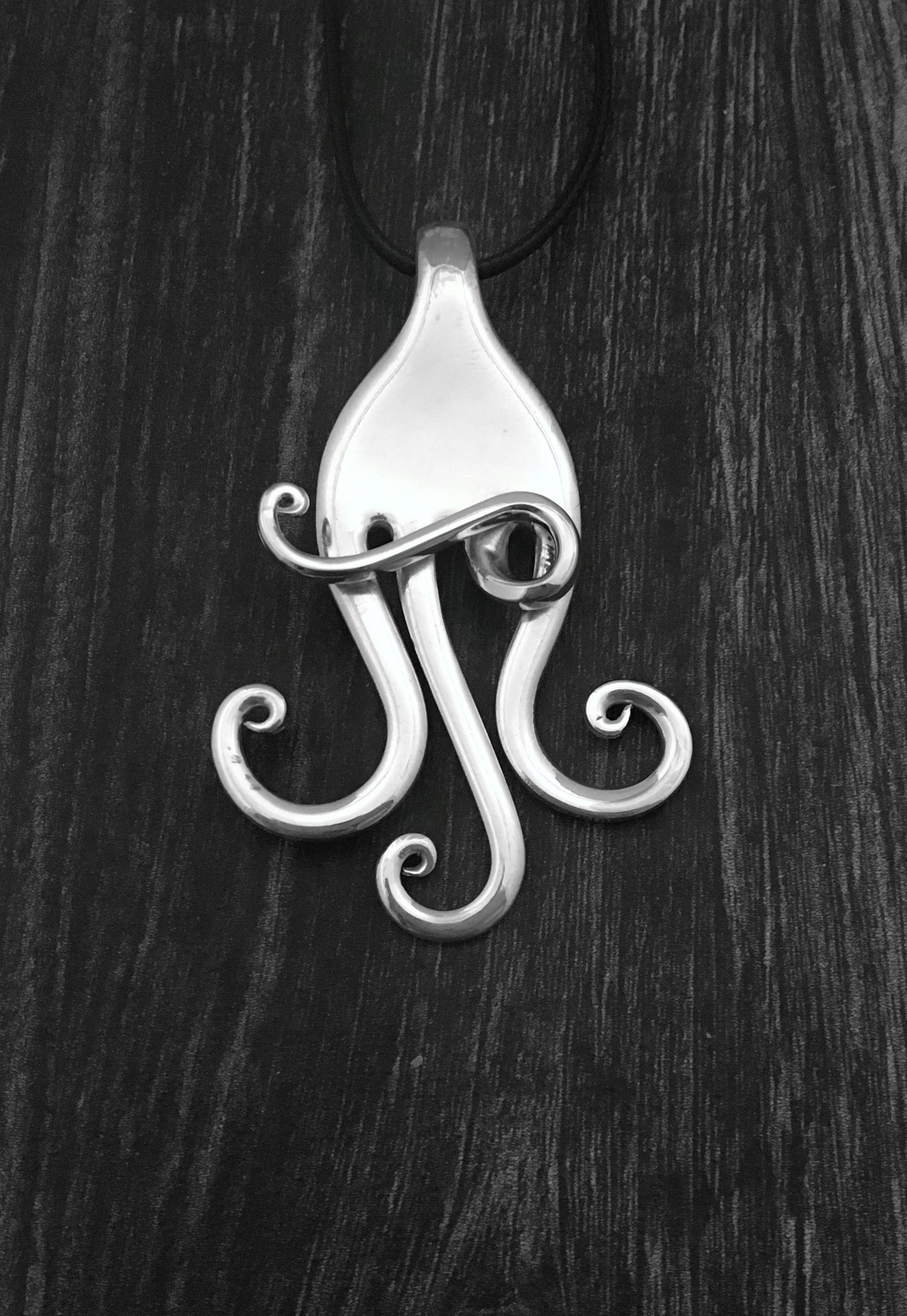 A necklace crafted from a vintage silver plated dinner fork bent into an abstract design. Approximately 2.5 inches tall and 1.5 inches wide.