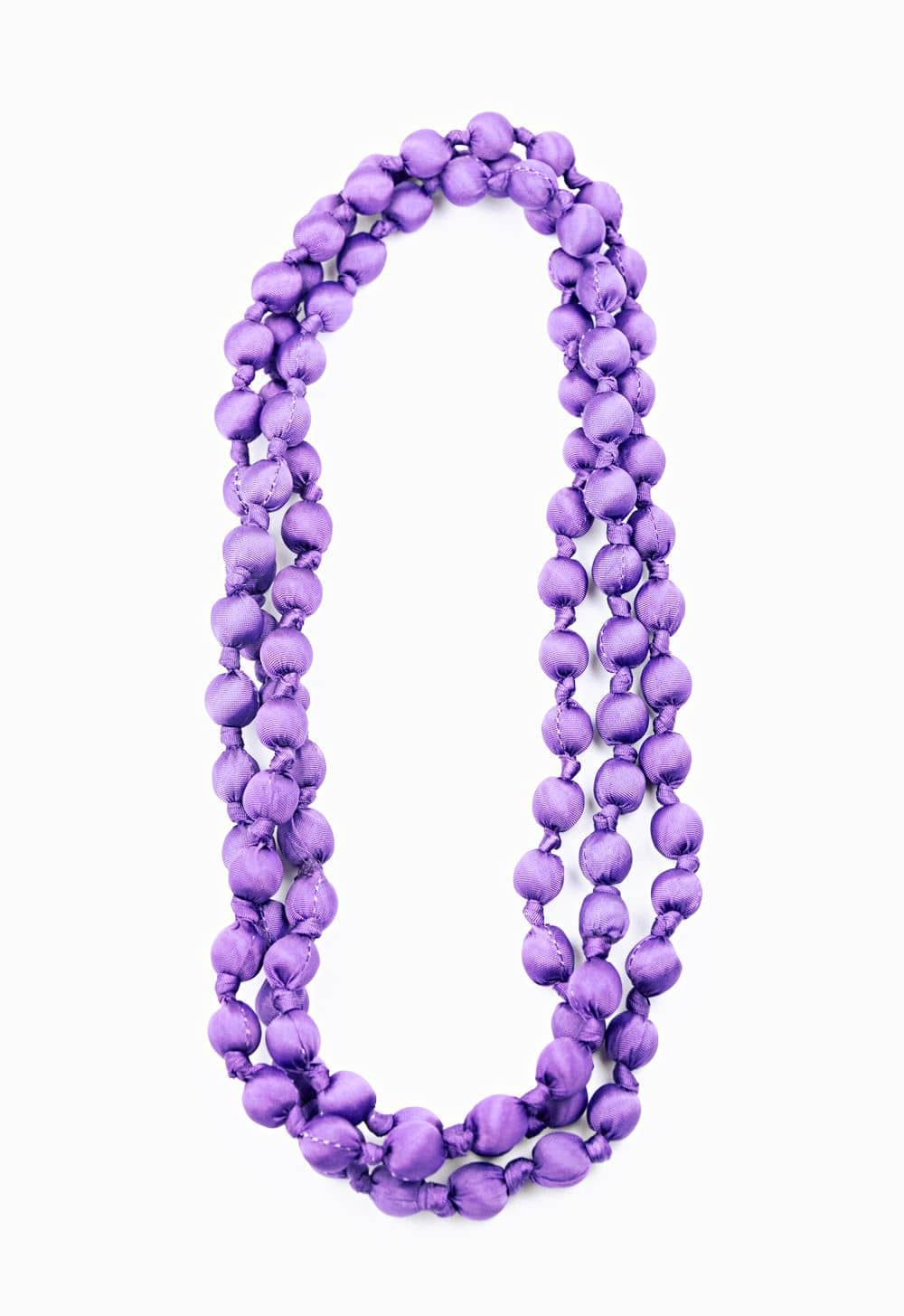 Necklace of fine workmanship made of 100% silk long enough for three loops around the neck. Sold in its own silk pouch. SILK AND WOOD. Certified azo free ecological colours. Composed of approximately 250 0.5 cm silk spheres.