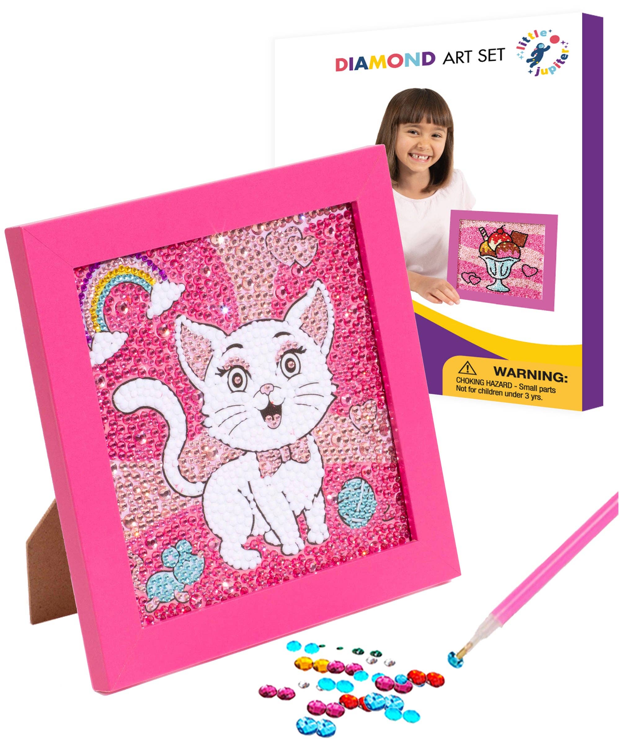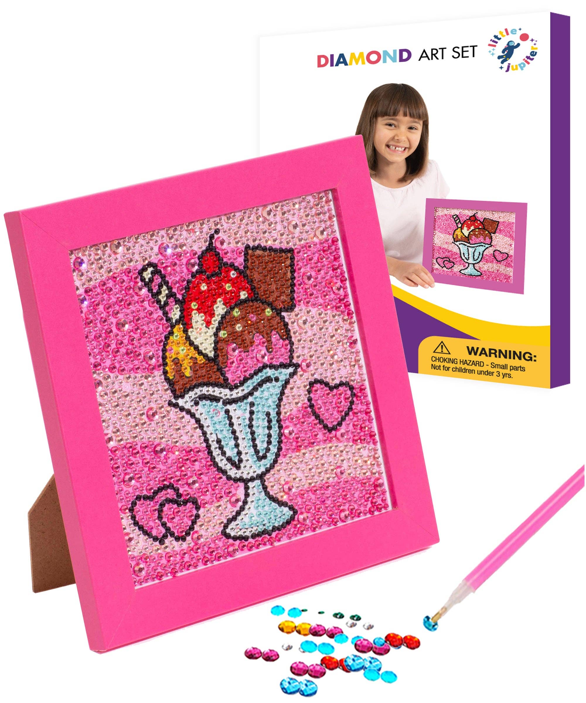 Diamond Art Kit Set 7 1/8" x 7 1/8" with Frame (Llama with Blue Frame) Sparkle and Create. Shine Bright with Little Jupiter Diamond Art Are you looking for a great way for kids to pass the time? Perhaps something that unlocks a child’s creativity? Rainy day project that requires focus? A gift? Look no further than the Little Jupiter Diamond Art Set. A wooden canvas art set similar to paint by number projects. The perfect beginner set for kids 6 years and up. Average build time is 2+ hours. Kids will love the end result from their hard work. How Does It Work? Each set includes a themed canvas art with a plastic film & a sticky design surface. As you peel back the film, you will see various symbols. You simply use the pen tool to stick into the jelly glue. Then use the pen tool to place the correct colors to the sticky canvas art for a dynamic sparkling brilliance that will delight! Complete the set and feel a sense of achievement & attention to focus. Diamond painting for kids helps children with puzzle solving & creativity development. Everything You Need for The Perfect Gift Each kit includes a 7 1/8 x 7 1/8” colored wooden frame with kickstand, canvas art, plastic pen tools, resin colored diamond bags, jelly glue, & tray. A tremendous gift for birthdays, Christmas, Hanukkah, special occasions, and more! Designed For Children. Build It Together Designed for boys & girls. Available designs include unicorn, flamingo, ice cream, cat, llama, teddy bear, and more. Buy two for even more sibling fun! A great activity for brothers and sisters to accomplish together. Try it after school, on rainy days, vacations, and more! Little Jupiter’s kid diamond art sets makes a great gift for children ages 6,7,8,9,10, & more. Collect all of