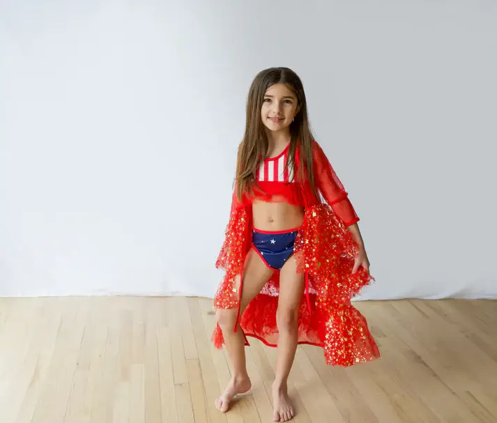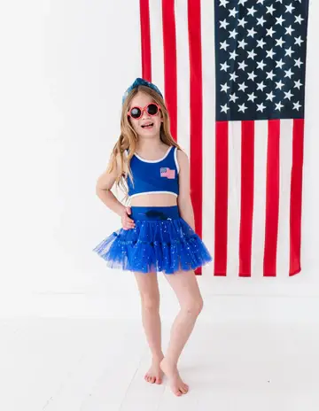 Adorable bike shorts in an athletic fit with a fancy twist! The mesh sequins star ruffle skirt layer is attached with a thick waist band & adjustable tie with star detail. Ships April week 2