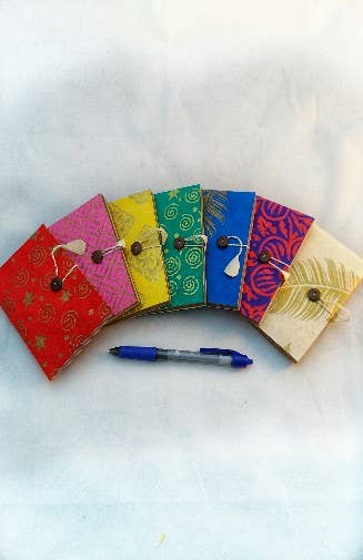 Soft cover notebook journal with hemp tie and coconut buttons measuring 4.5″ wide x 6″ tall. Made from environmentally sustainable lokta paper (tree free!) Comes in four water designs, 30 pages.