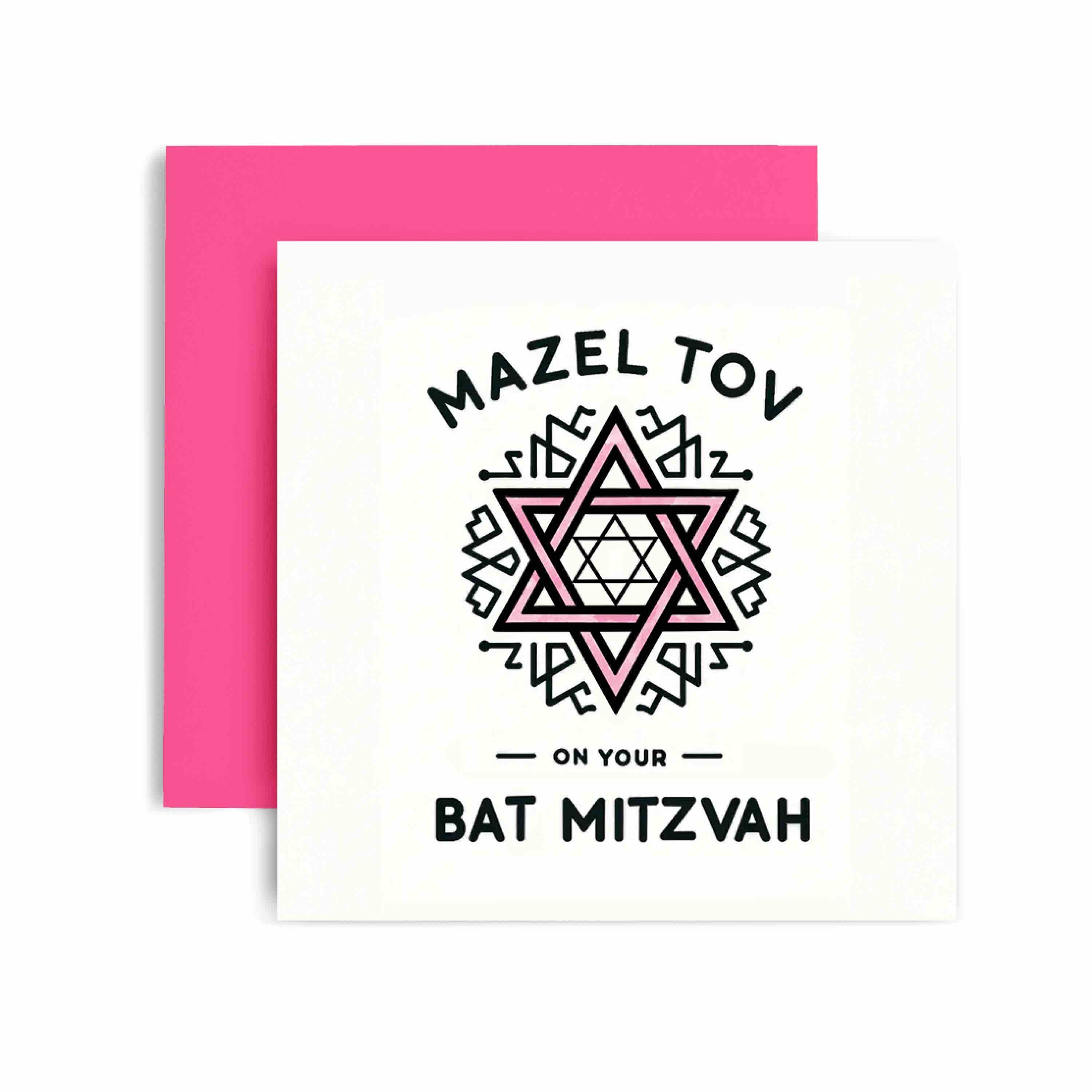 A2 Size Greeting Cards (4.25 x 5.5 inches folded). Inside greeting: "WISHING YOU A LIFE FILLED WITH JOY, SUCCESS AND ACHIEVEMENT. MAZEL TOV!" Printed on premium recycled paper. Paired with recycled white envelopes. Packaged in cello.