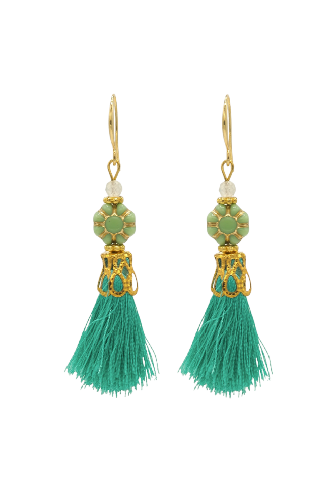 18k gold plated brass hook earrings with Czech glass, taupe cotton tassels, and brass.