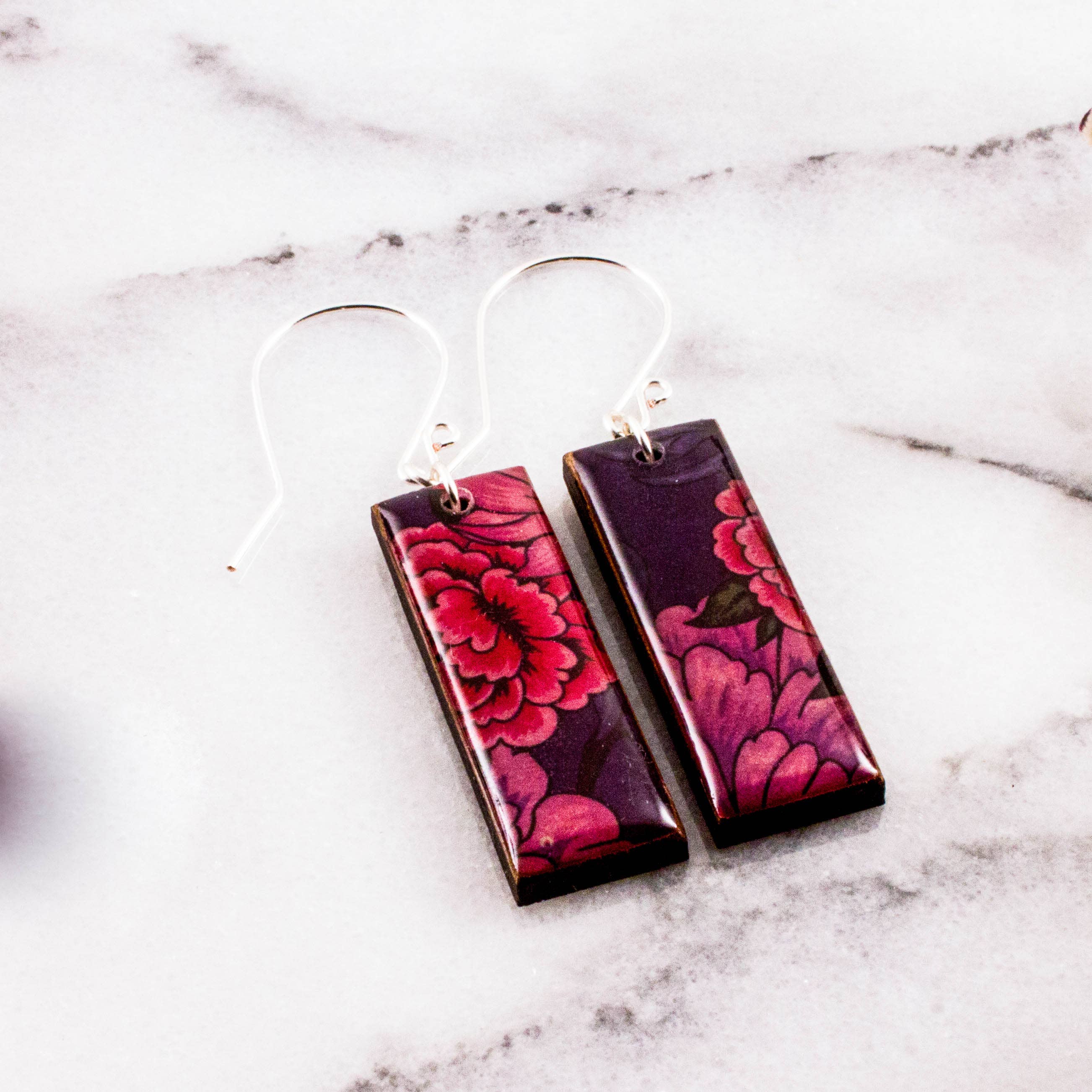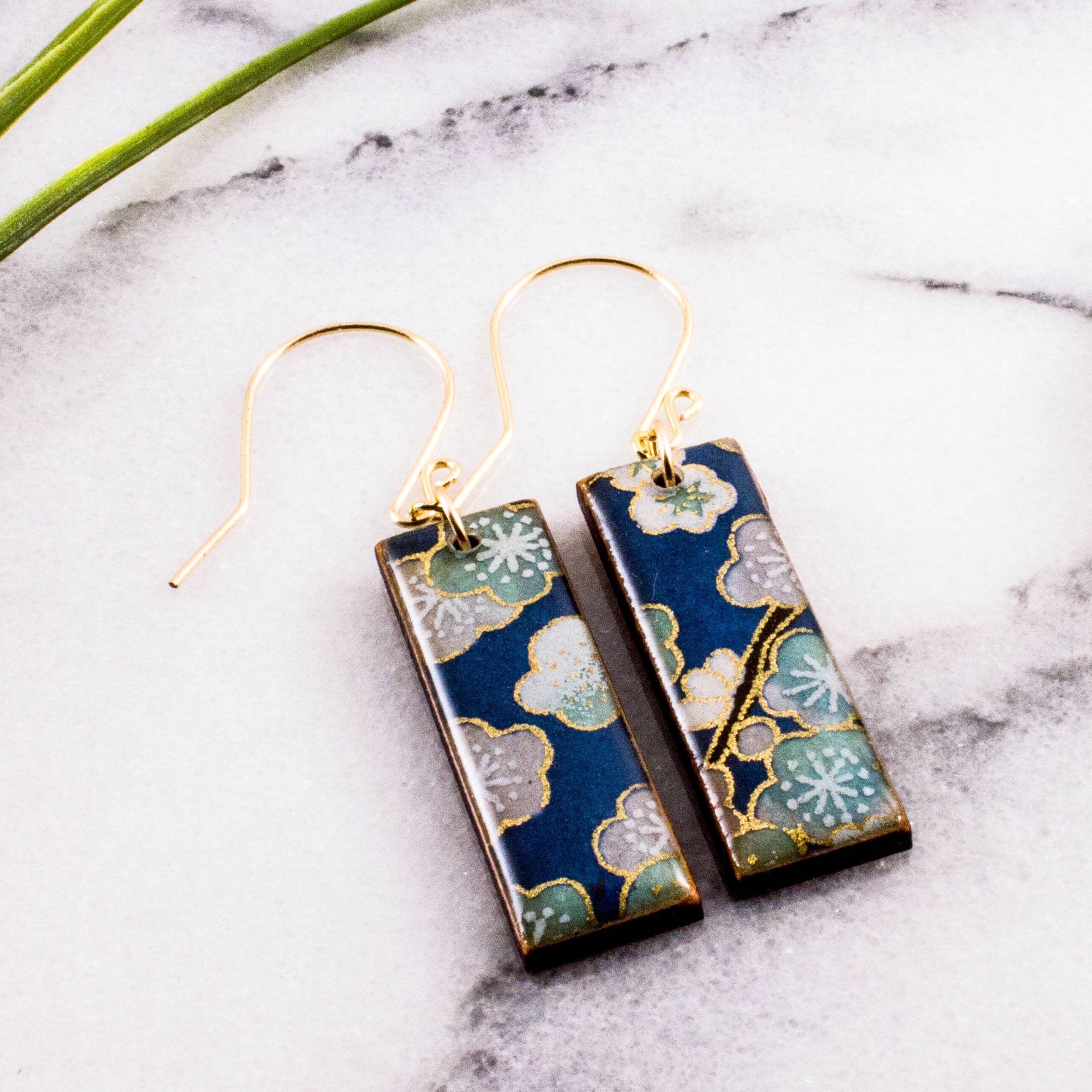 Bold, yet effortless, these earrings are lightweight and comfortable to wear all day. Handcrafted from sustainably harvested maple wood, handmade yuzen paper from Japan, glossy, vegetable-based resin, and handcrafted gold filled ear wires. Please note... each pair is unique. Pattern placement will vary. Earrings are approximately 3" long.