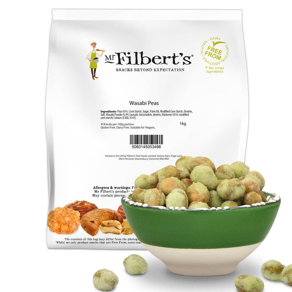 A mix of spicy corn, wasabi peas and salted pretzels, the perfect non-nut snack alternative. * Vegan * Dairy Free * Made in the UK Ingredients & Nutritional Information per 100g Barbecue Corn (Corn, Sunflower Oil, Barbecue Seasoning, [salt, maltodextrin, yeast extract, natural flavourings, onion powder, tomato powder, paprika, garlic powder, Flavouring: smoke flavouring, glucose syrup, Acidity Regulator: citric acid, Colour: paprika extract]). Wasabi Peas (Green Peas, Corn Starch, Sugar, Palm Oil, Modified Corn Starch, Dextrin, Salt, Wasabi Powder [wasabi, horseradish, dextrin, thickener: gum arabic, modified corn starch], Colours [E100, E141]). Salted Pretzels (WHEAT [GLUTEN] Flour, Salt, Rapeseed Oil, WHEAT Malt, Yeast, Raising Agent [E500], Acidity Regulator [E524]). 210 kcals per 50g portion