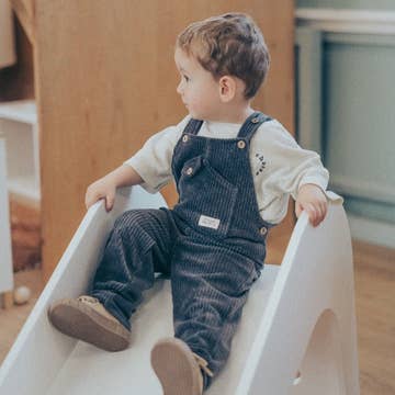 The kids' overalls are soft, breathable, and gentle on kids' skin. Designed for everyday wear, the relaxed fit allows easy movement for play, walking, and exploring. Adjustable shoulder straps provide a flexible fit as your child grows, while durable stitching helps maintain shape and comfort wash after wash. Easy to layer over bodysuits or tees for year-round use. -Made of: 95% GOTS-certified organic cotton, 5% Spandex -Color: Navy stripe