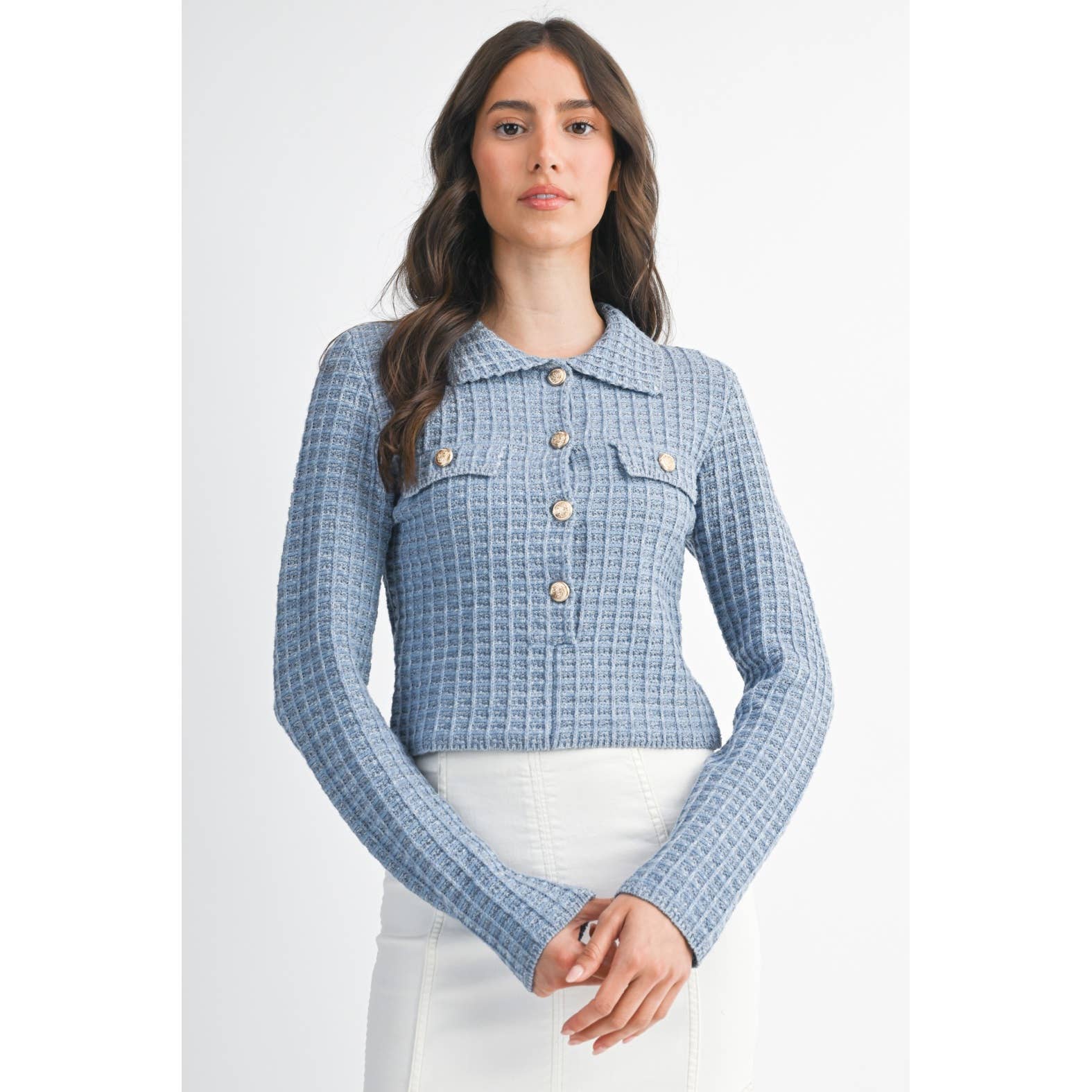 Experience the perfect blend of style and comfort with our blue ruffled cardigan. Designed to elevate your wardrobe with its chic details, this cardigan offers a delightful solution to staying fashionable and cozy during cooler days. Eye-catching ruffle design adds a touch of elegance Soft, cable-knit fabric ensures warmth Versatile style pairs easily with casual or dressy outfits Model is wearing a size S Model : 5'9" - B 32" - W 24" - H 35"