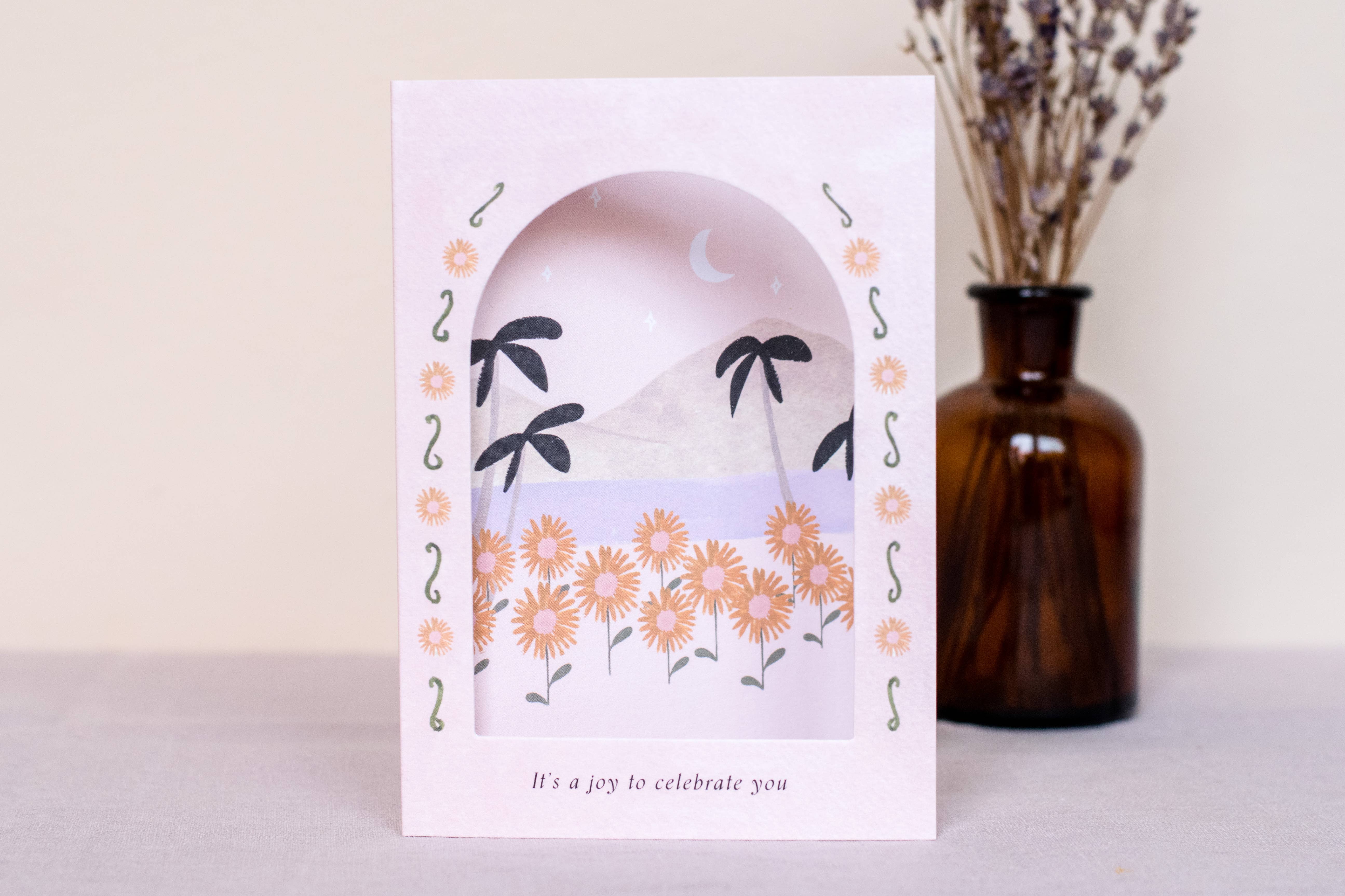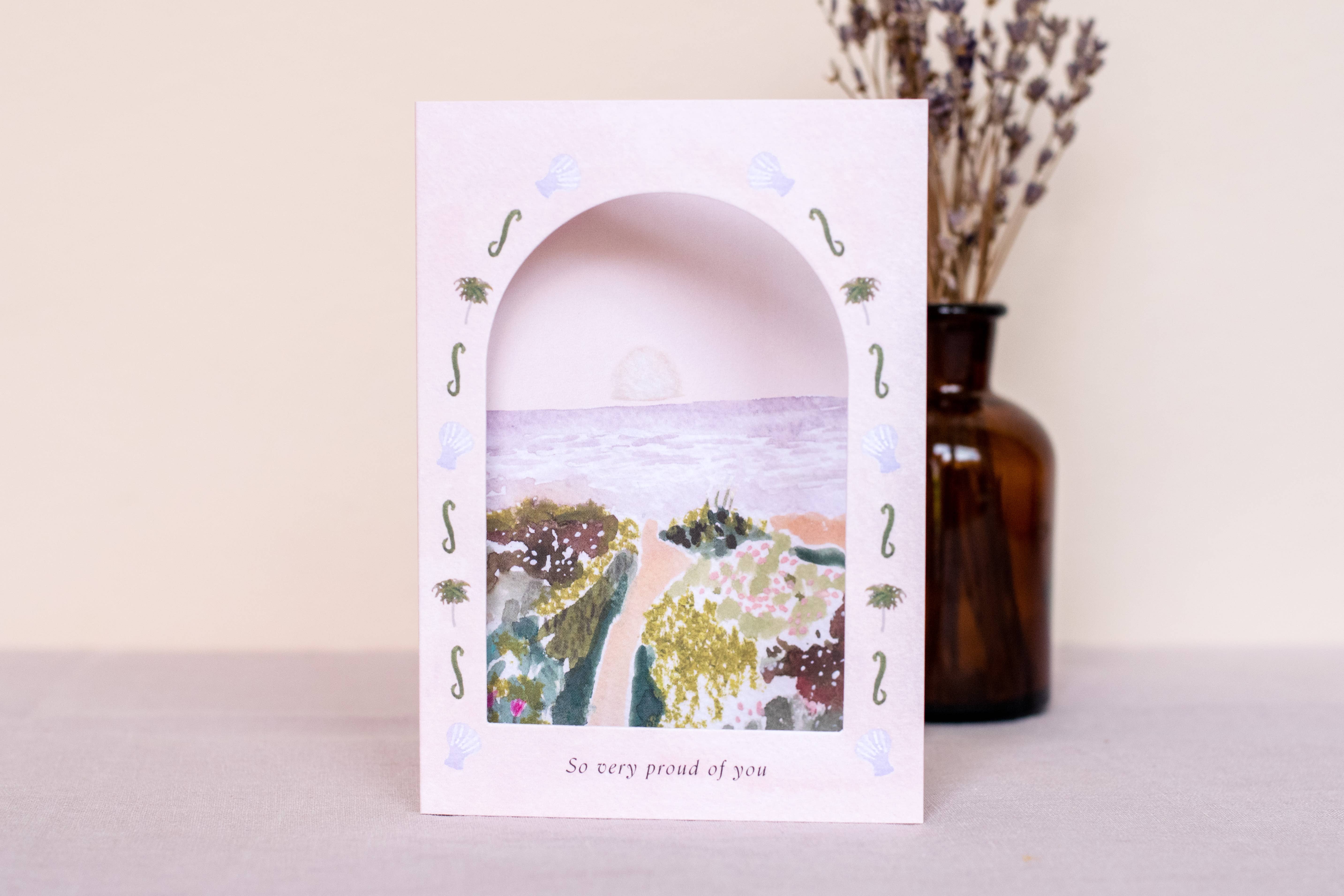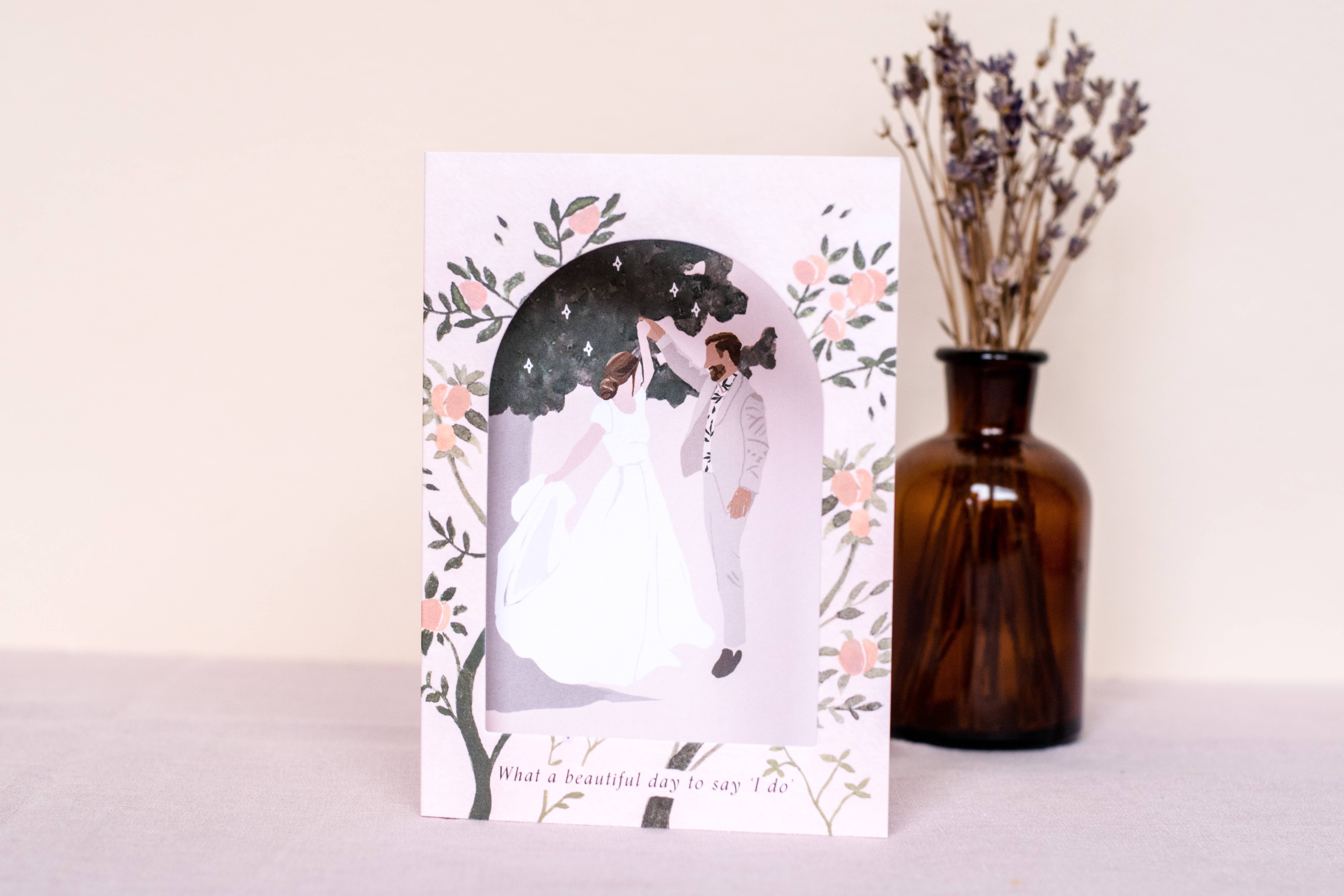 Wonderfully unique arch window greeting card printed on luxury FSC 'kind to the forest' card. Blank on reverse to leave lots of room for loving words. Each card comes with a luxury envelope in a biodegrable and compostable sleeve. Designed, printed and packed in England. Minimum order 6 per design.