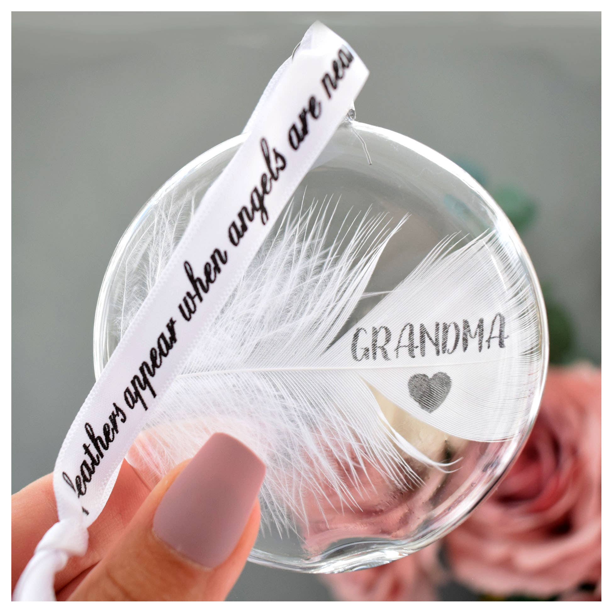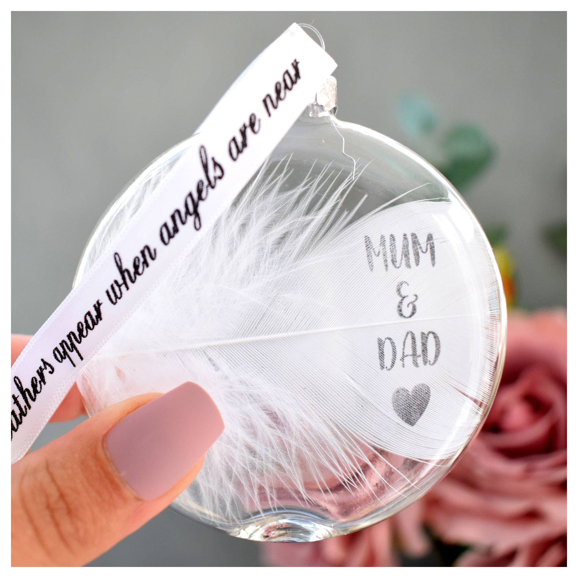 This bauble features a white feather that has the wording 'MY ANGEL' on the feather with a heart print below. This is directly onto the feather making it so unique and special. Perfect for remembering your loved ones. These baubles are a stunningly elegant design, they are purposely designed to be a sophisticated colour palette so as to match any decor. They are presented in a simple white organza gift bag. Each feather is placed inside an 8cm(L)x 8cm(W) x 2cm(D) (not a globe shape, it is flatter) Round Shaped, glass bauble which is threaded with a printed ribbon reading "feathers appear when angels are near" measuring approx 13cm's. Please note - Handstamping is where each letter is stamped onto your feather individually and by hand, giving the result of not being perfectly uniform in finish. These are stunning christmas Decorations for the tree and for all year around. The make fab xmas seasonal decor as well as being a perfect memorial sympathy gift.