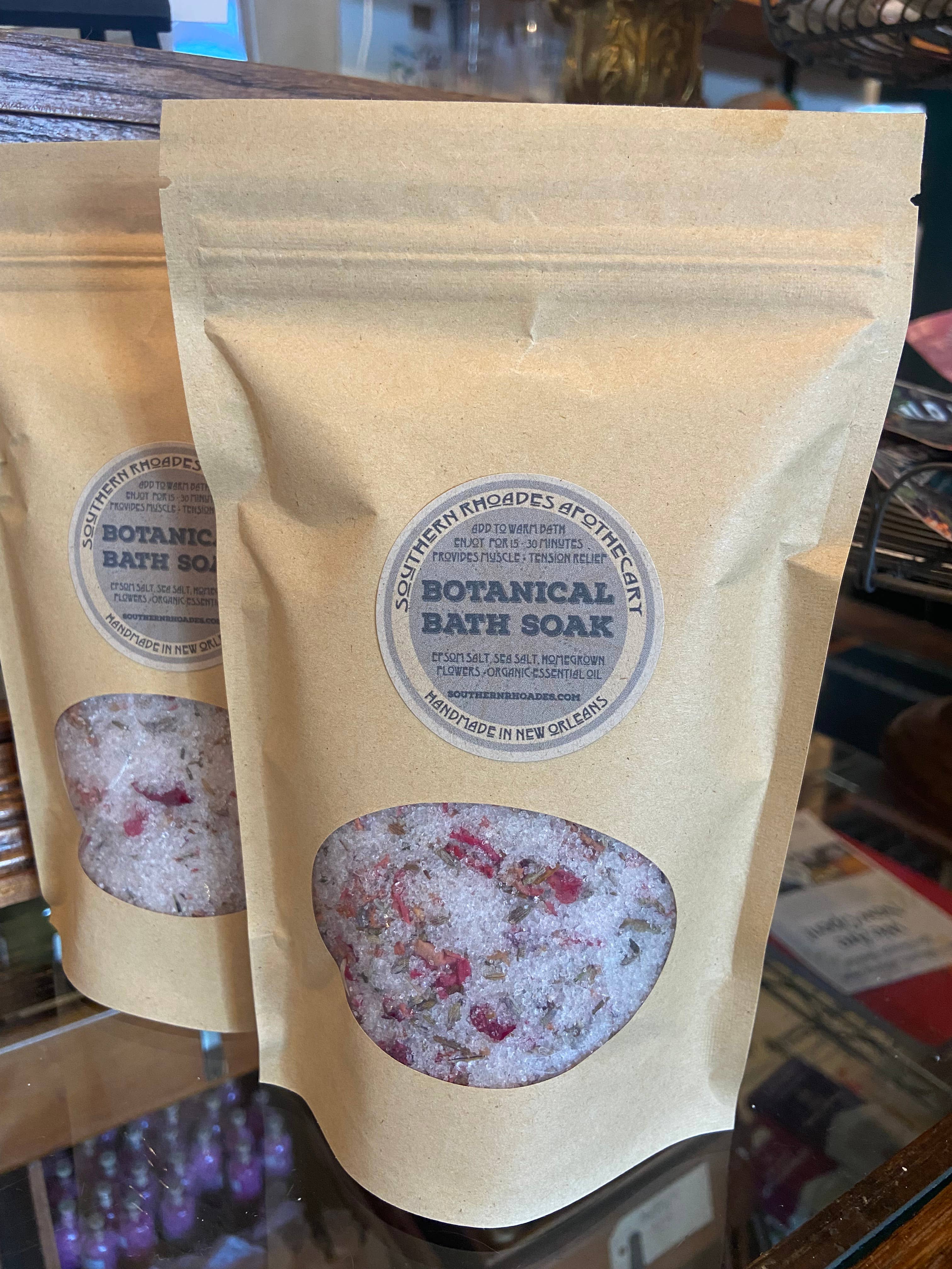 This botanical Bath Soak is a wonderful addition to your bathing ritual. Use as needed to help aid in relieving muscle tension and relaxing the mind & body. 4 oz glass jar with cork | No Synthetic Additives or Preservatives TO USE: Add desired amount directly to warm bath water. Soak for desired length of time. KEY INGREDIENTS Epsom Salt: Promotes relaxation + Rejuvenates your skin rather than drying it out. Sea Salt: All natural + Solar Evaporated + Gathered from the Pacific Ocean on the West Coast of USA. Rose: Anti-Depressant + Anti-Inflammatory properties. INGREDIENTS: Epsom Salt; Pacific Sea Salt*, Himalayan Salt, Flowers, Blend of Essential Oils* *Denotes Organic