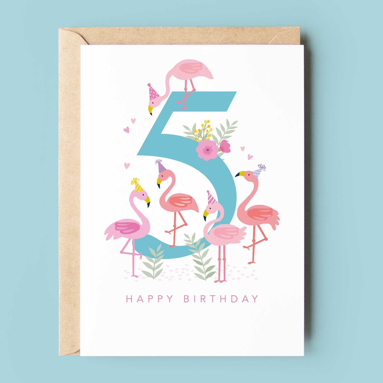 Age 5 Flamingo Girly Birthday Card. A pretty blue number five is adorned with 5 fun flamingoes wearing party hats. A delightful birthday card for any child turning 5 years old. * Size - 120mm x 170mm * Blank Inside * Envelope - Brown Ribbed * Printed on premium 350gsm FSC certified card stock * Supplied naked as standard. Biodegradable cello available upon request * Sold in quantities of 6 Designed and printed in the UK. Fully recyclable.