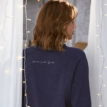 ♻️Fabric made from textile recycling. 🇵🇹 Made in Portugal. 100% cotton. Model is wearing size S and is 164 cm tall. Gray washed effect cotton sweater. With ribbed cuffs, belt, and collar. Printed on the front. Wash at 30º.