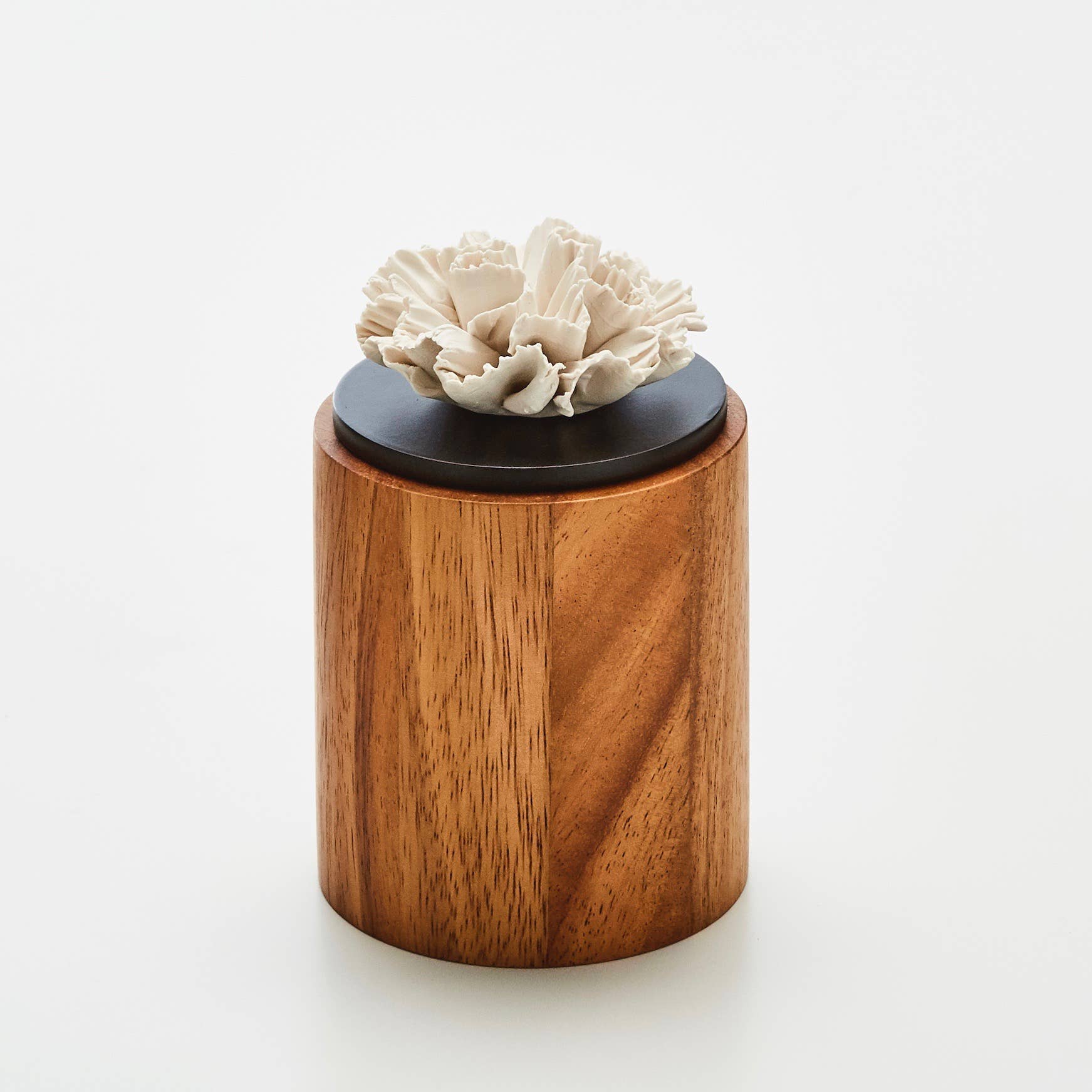 Fragrance diffuser and essential oils. Handcrafted porcelain flower, Acacia wood base. Artisan product made in the workshop with natural materials. Discover our scents specially designed for our aromatic diffusers (see product sheets in the store). Our fragrance diffuser is very easy to use. Place 3 or 4 drops of perfume or essential oil on the porcelain flower and renew every 3 days. It is a natural diffusion that requires neither electricity nor batteries. You can fully and serenely enjoy the beneficial effects of aromatherapy! Each flower has secure individual packaging, resistant to transport. This product is part of our floral range composed of a rose, a jasmine, an orchid, a gardenia, and a carnation. Our scented flowers are available in white, gray, or black. Its versatility makes it an ideal gift for events and celebrations throughout the year.