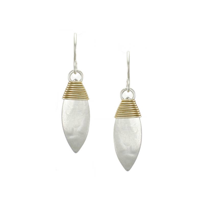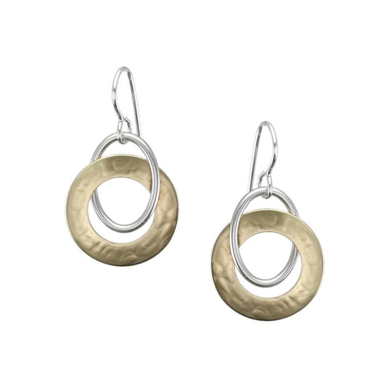 Two lightly hammered interlocked rings. Lovely geometric earrings with clean sculptural curves. Brass and silver wire earrings. Dimensions: 1 wide x 1.2 inches long (measured from the base of the wire). Backing Options: Wire Available Metal Colors: Brass and Silver