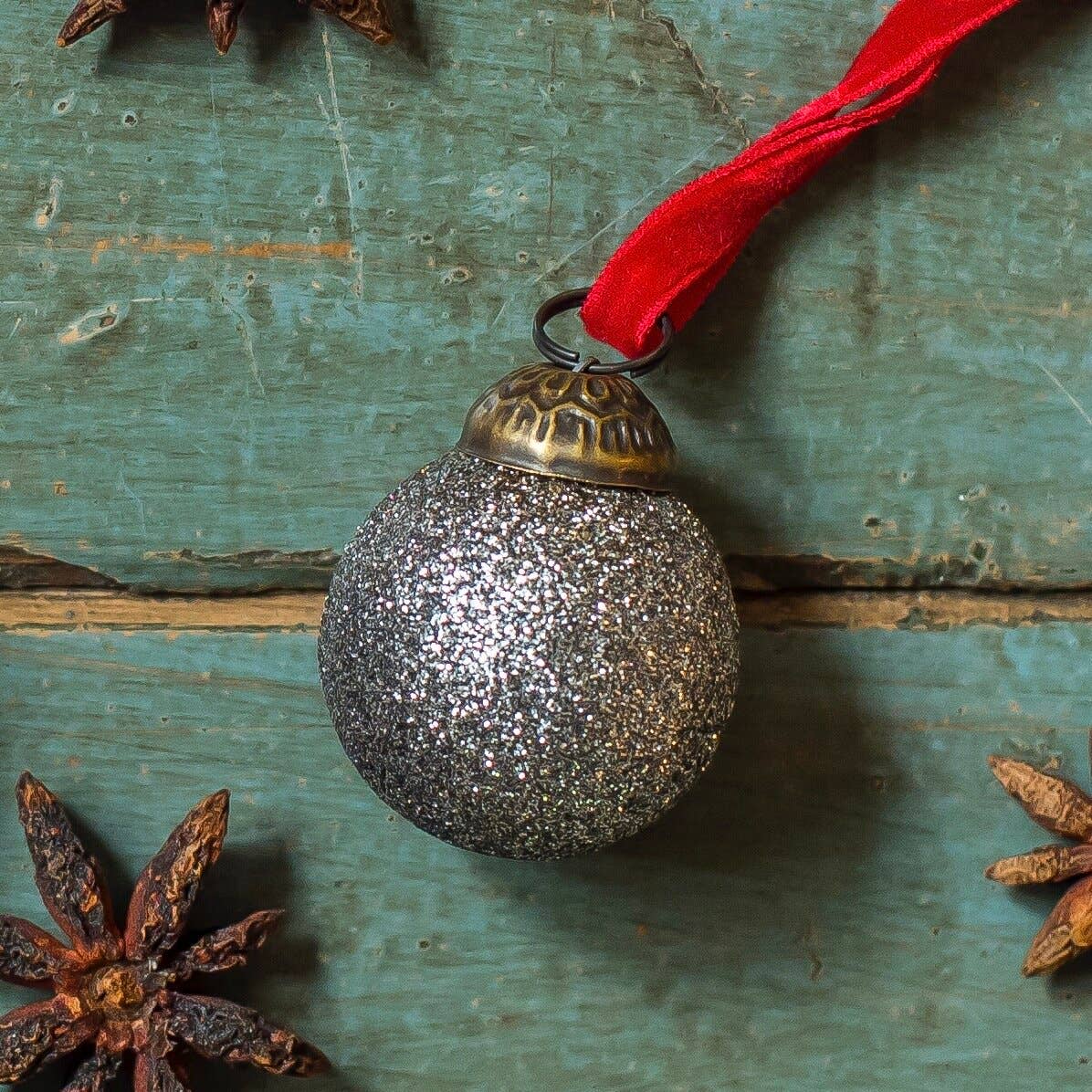 Lovely weighty silver glass bauble etched out in a matt design. Assorted velvet ribbon. 4 sizes available - 5, 7, 15 and 20 cm Made in India