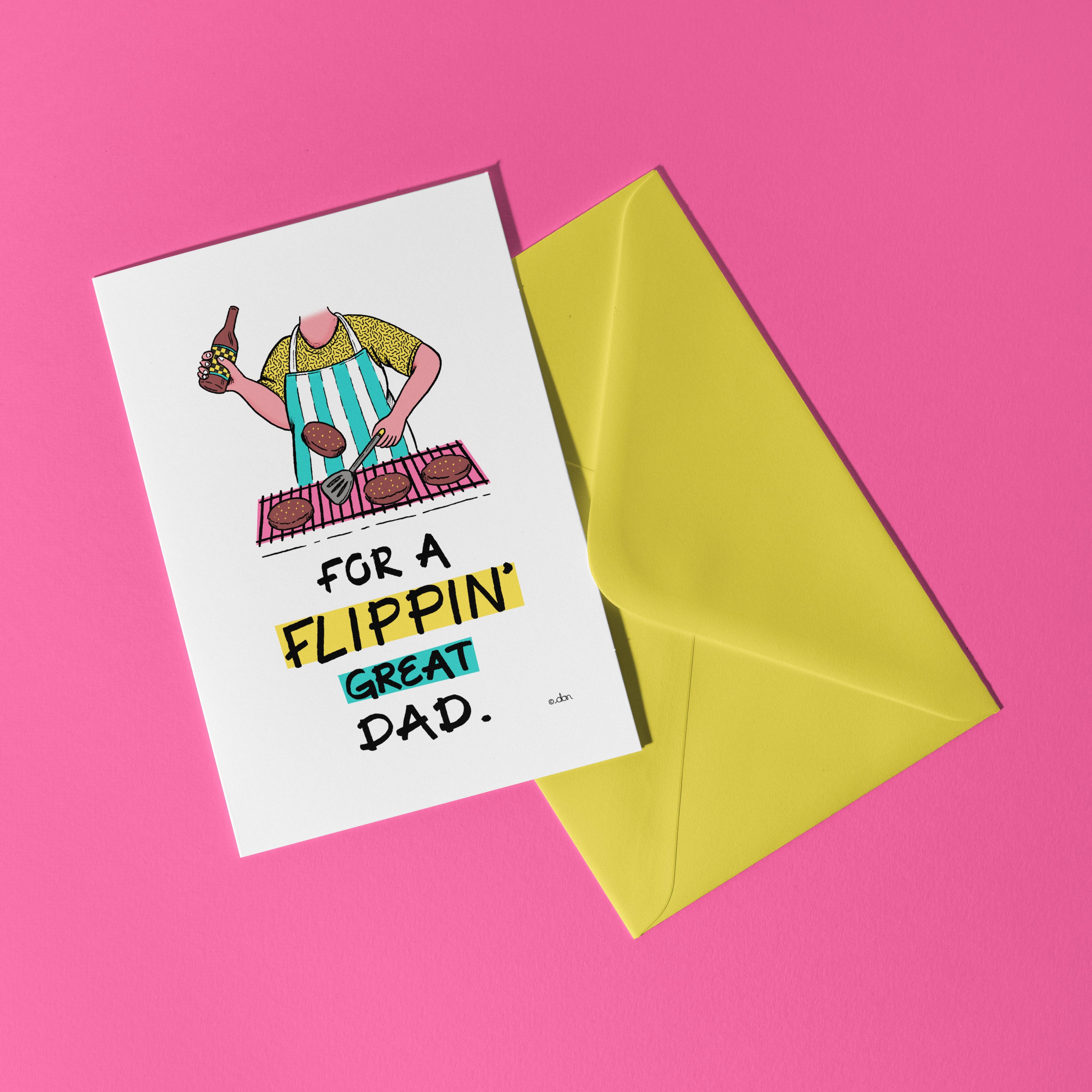 A punny dad joke celebrating all the things that dads do for us in a sparkly, dramatic design. A2 card printed with rich, vibrant inks on thick, matte stock with a velvety soft-touch finish. Blank inside, comes with coordinating colored euro-flap envelope. About my greeting cards: - All my designs are hand-lettered and illustrated by me (no fonts or stock graphics, ever) - A2 cards measure 4.25x5.5 inches - Packaged in crystal clear protective sleeves that are commercially compostable - Designed and printed in Denver, CO - Blank inside