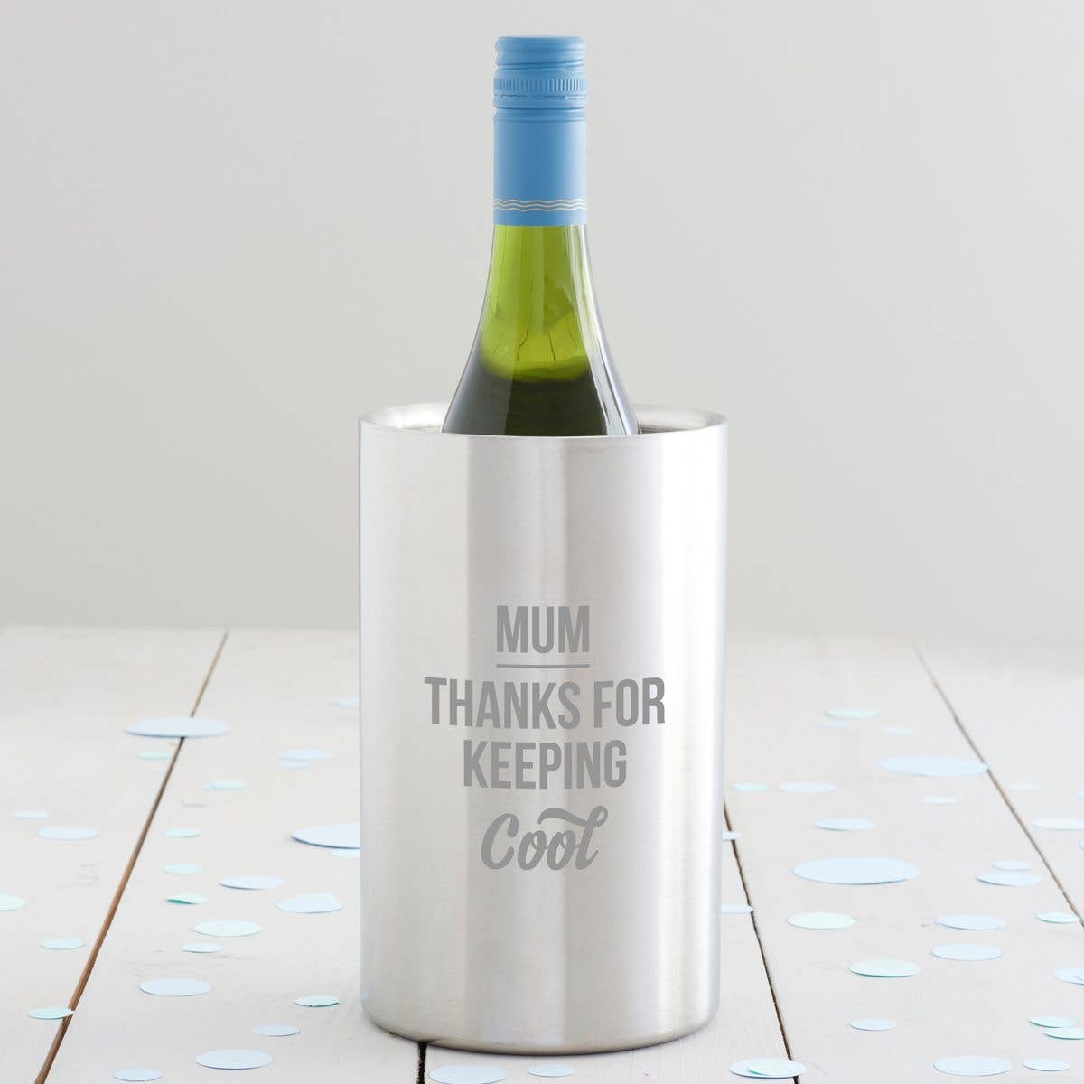This Modern Concrete Wine Cooler is a unique piece, wonderful for gifting or adding to your tableware collection. Keep your chilled wine at just the right temperature for serving in this stylish vessel. This unique Terrazzo concrete handmade item is perfect for dinner parties, wedding receptions, and restaurant table serving. Holds a standard size wine bottle, or slimmer sparkling/champagne bottle. Coated with non-toxic sealant to protect the finish. Includes cork attached inside and to the bottom to prevent scratching of surfaces. Instructions for Use: Place in freezer for at least 2-4 hours (or overnight) until frozen. Take it out and carefully place your chilled wine bottle inside, Will keep bottles chilled for several hours. Let it get a room temperature before you wash it by hand. -never put your concrete chiller wet in to the freezer. Dimensions: Height: 3.5 inches Outside diameter: 4.5 inches Inside diameter: 3.4 inches