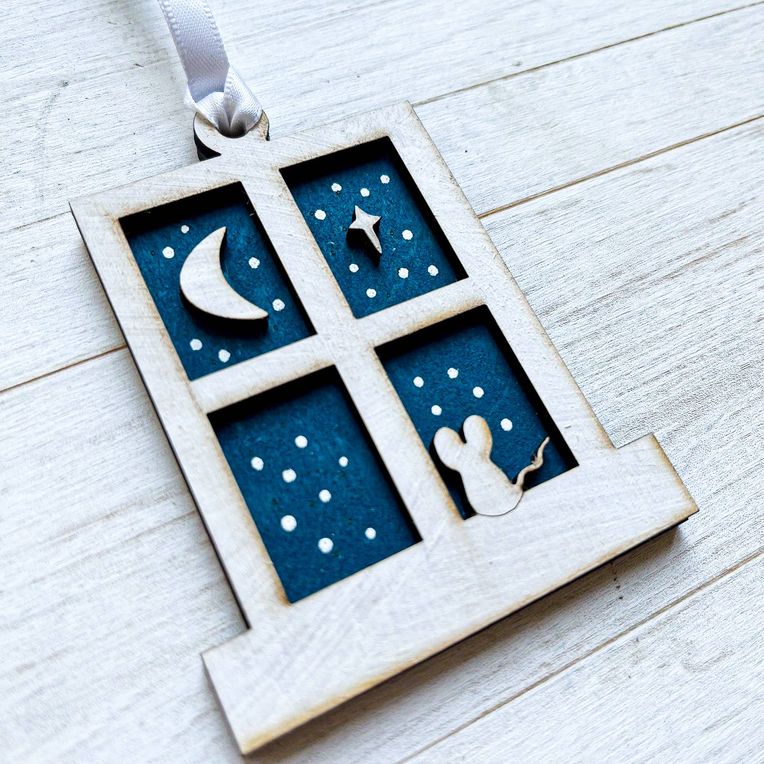 Moon Hare Decoration with optional customisation available. White moon hare looking at full moon. - 6.5 x 6.5 x 0.6cm - White Ribbon - Customisation Available - Location Engraved in scroll at bottom