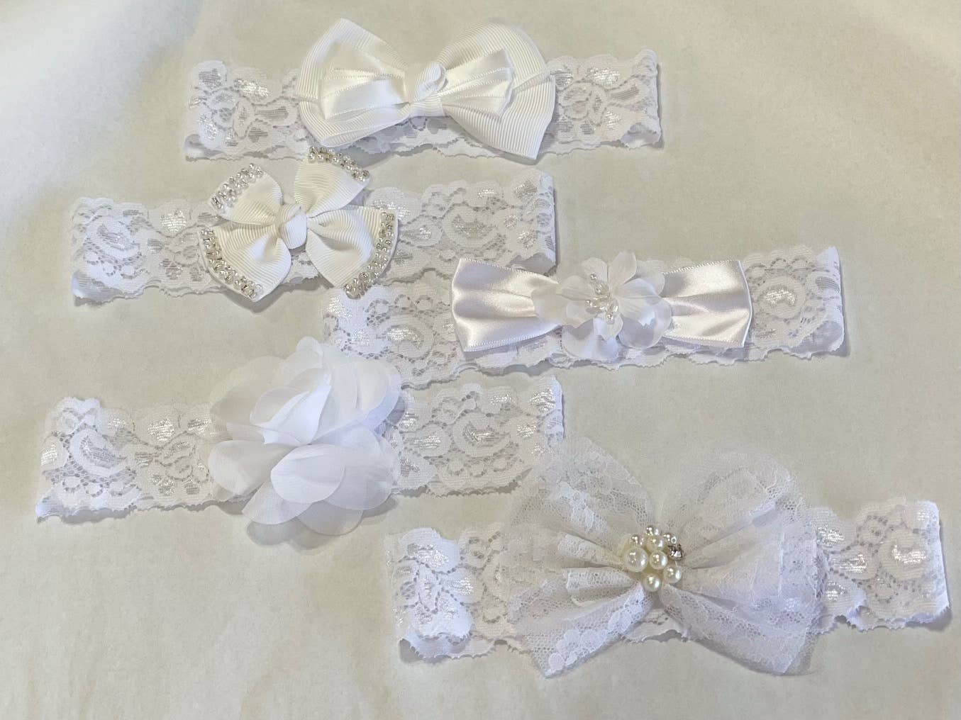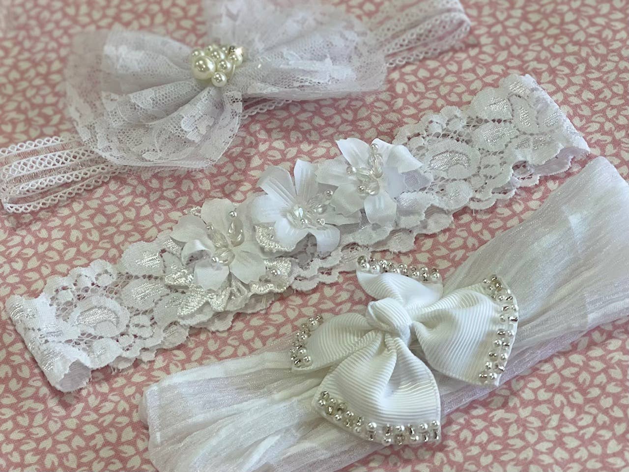White stretch lace baby headband with silk flowers and a soft embroidered organza bow. Perfect for Baptisms, Christenings, or any special occasion. Made in USA.