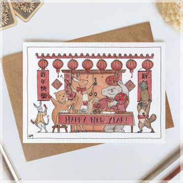 A beautiful city backdrop to a happy new year with fireworks and lanterns and magic. Boxes of 8: packaged in an eco-friendly kraft branded box with open window. no plastic on the window. All cards are A2, 4.25 x 5.5 & blank inside. Printed in the U.S. on 100% recycled FSC paper. Envelopes are kraft, 100% recycled. Illustrations by Cindy LaColla. @cynlastudio