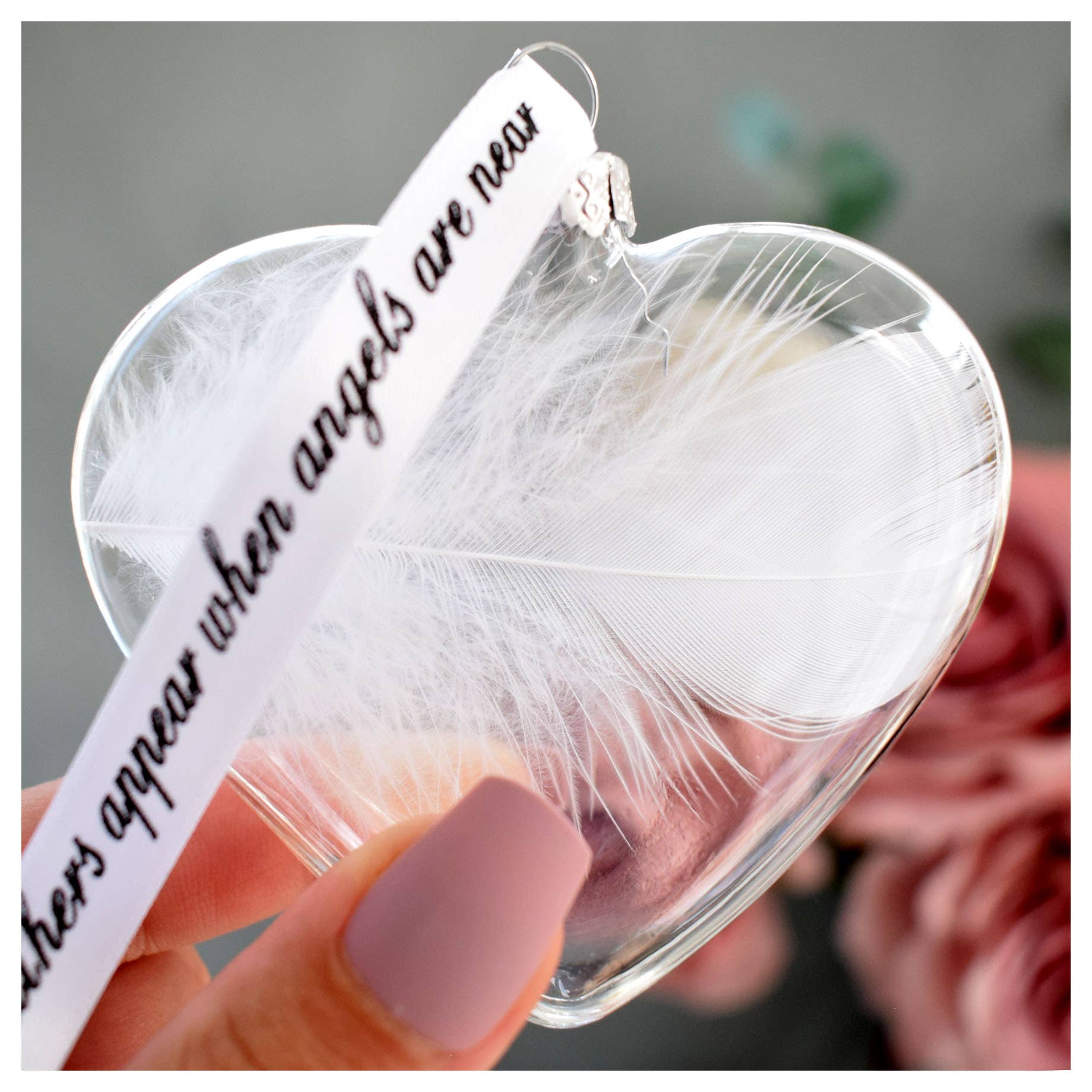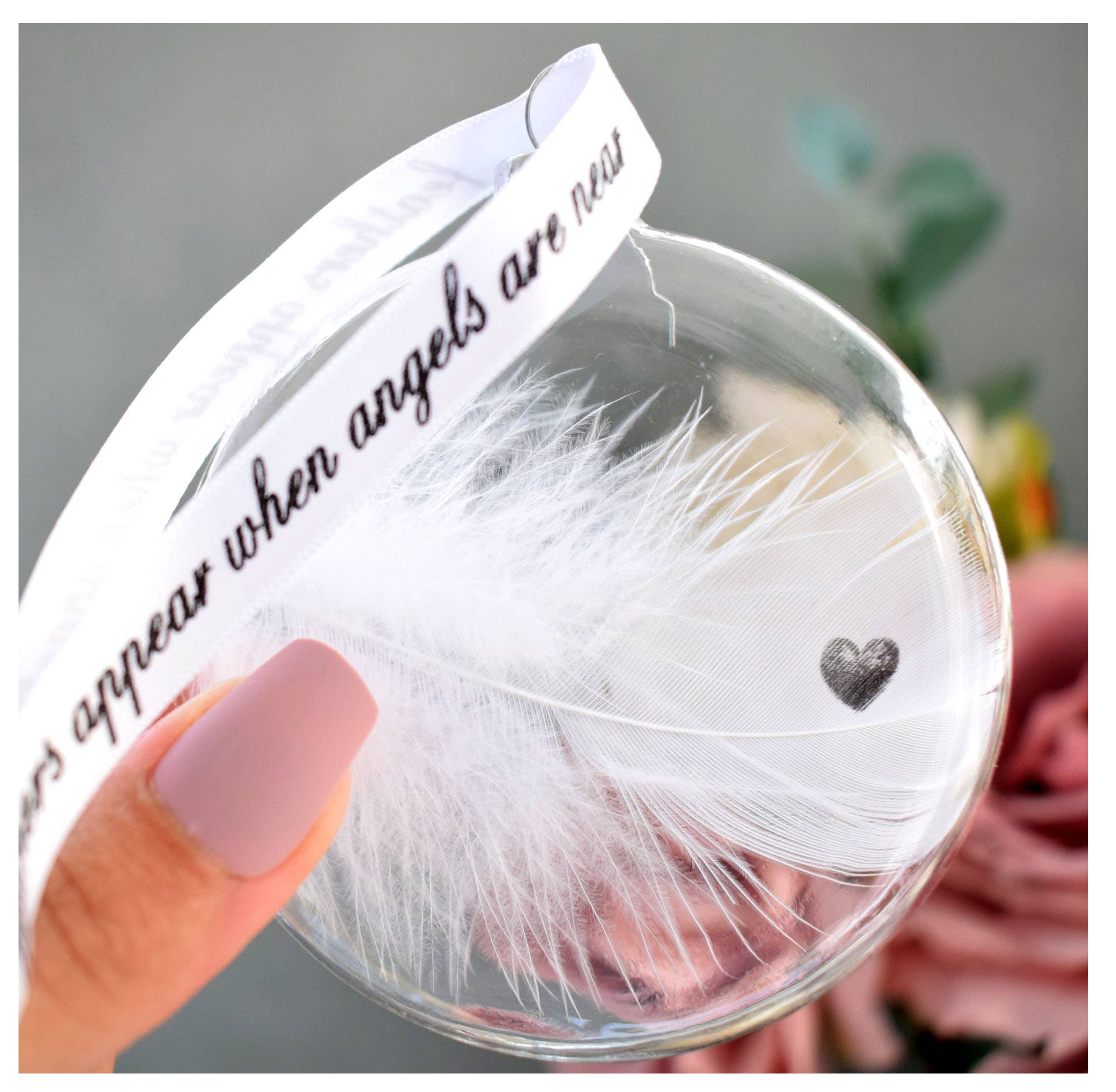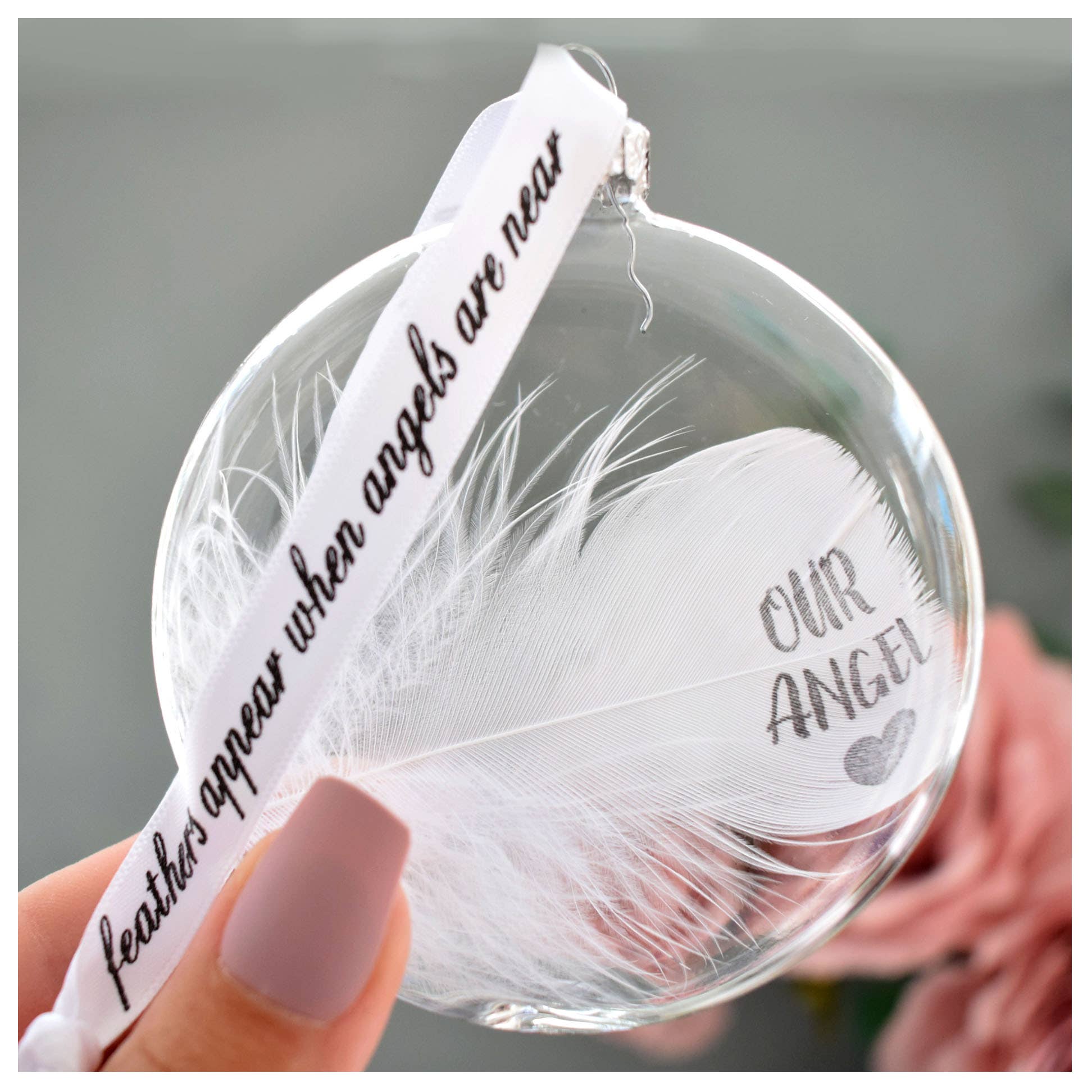 This bauble features a white feather that has the wording 'NAN' on the feather with a heart print below. This is directly onto the feather making it so unique and special. Perfect for remembering your loved ones. These baubles are a stunningly elegant design, they are purposely designed to be a sophisticated colour palette so as to match any decor. They are presented in a simple white organza gift bag. Each feather is placed inside an 8cm(L)x 8cm(W) x 2cm(D) (not a globe shape, it is flatter) Round Shaped, glass bauble which is threaded with a printed ribbon reading "feathers appear when angels are near" measuring approx 13cm's. Please note - Handstamping is where each letter is stamped onto your feather individually and by hand, giving the result of not being perfectly uniform in finish. These are stunning christmas Decorations for the tree and for all year around. The make fab xmas seasonal decor as well as being a perfect memorial sympathy gift.
