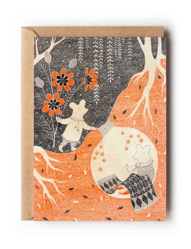 Letterpress printed A2, 4.25" x 5.5" single cards. Folded, blank interior, packaged with clear cello sleeve and coordinating envelope. Letterpress Card. Handprinted.