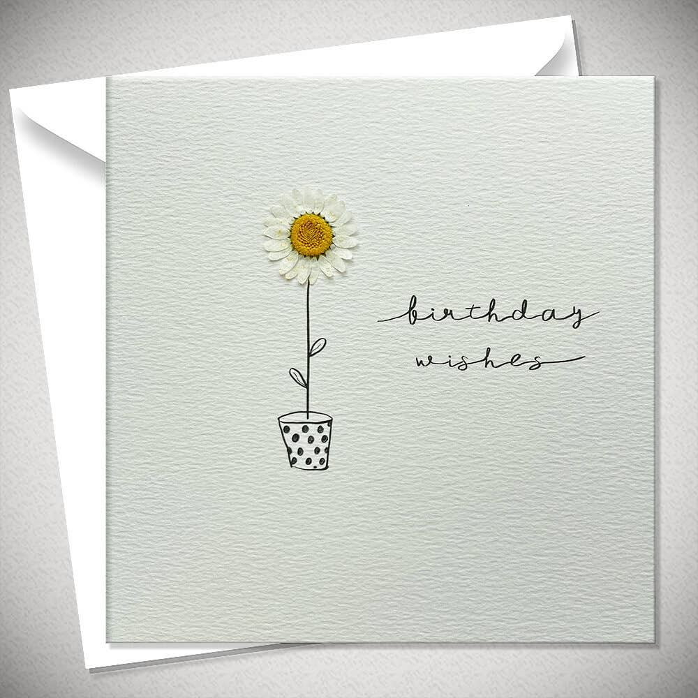 150mm x 150mm Printed and hand finished with a REAL pressed DAISY. Enclosed with a white ‘antique alabaster’ envelope and wrapped in a compostable cello.