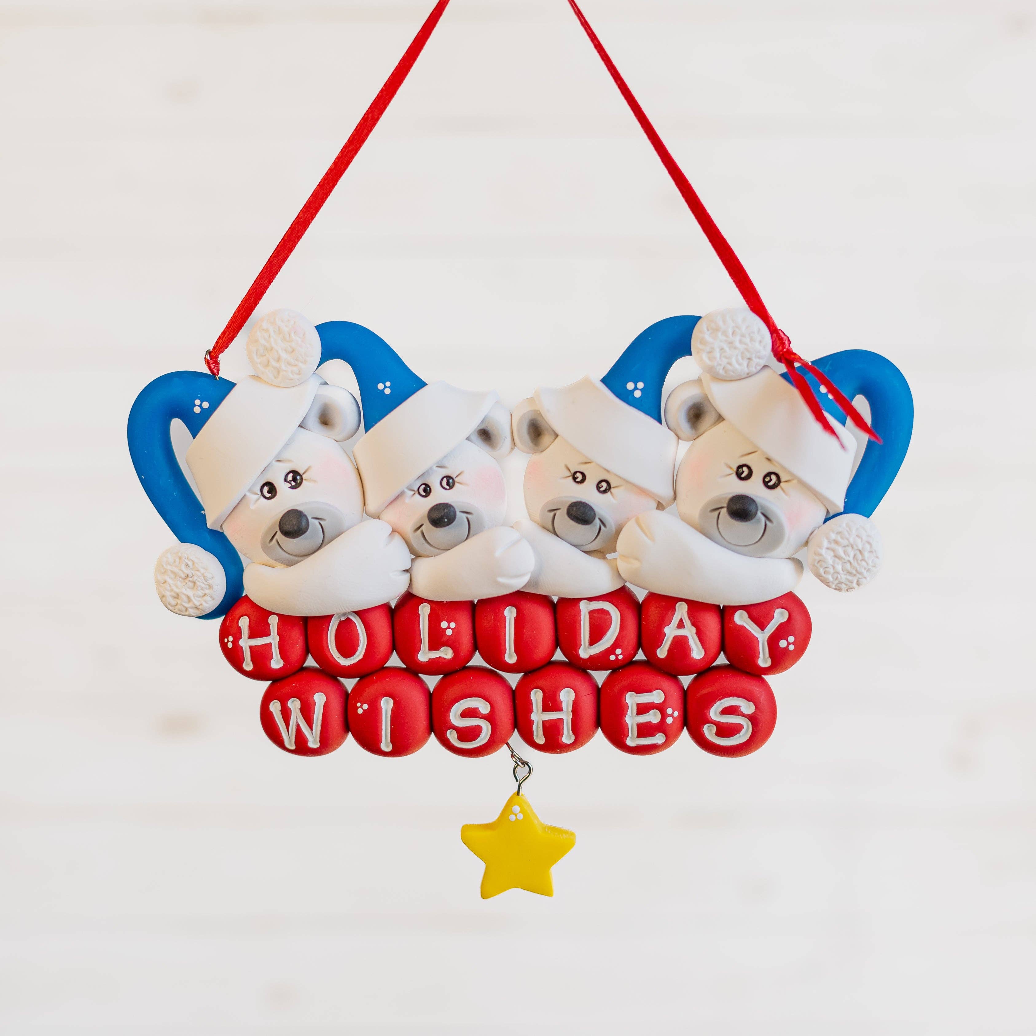 Any of our ornaments can be personalized as we always leave room to write a name and/or the year if you wish. This is solely up to the discretion of you, the buyer, and we can give advice on the type of pens we use as well as how to correct any mistakes made. Every one of our ornaments are made by hand, without the use of molds, so there may be slight variations to each ornament as it's impossible to make them all exactly identical. The eyes are either made from resin or glass and the rest of the ornament is made from polymer clay unless otherwise stated. Size: 2.75" L x 3.25" W Weight: 56g