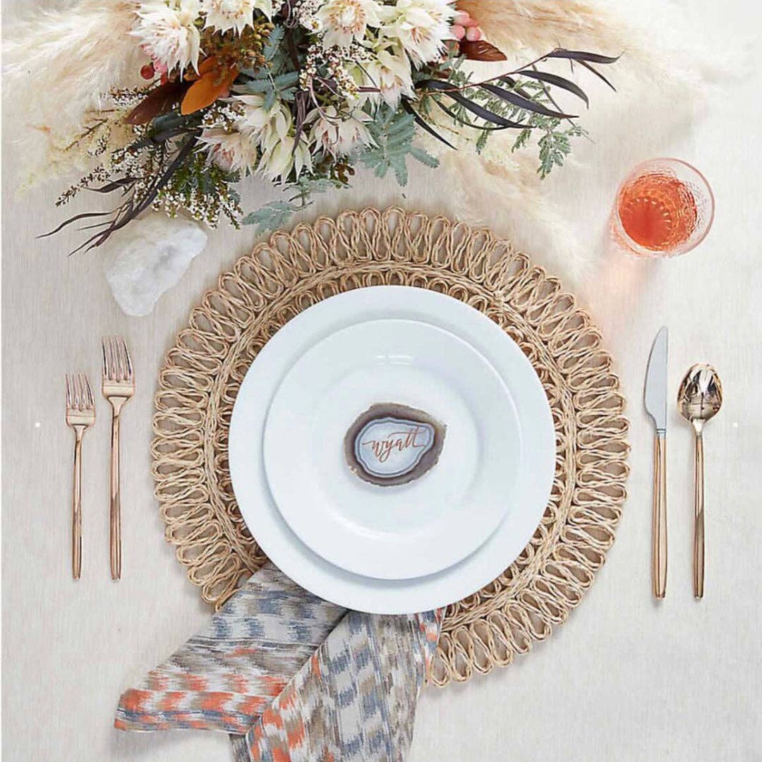 In lieu of traditional place cards, why not greet guests with a personalized oyster shell, which doubles as a thoughtful keepsake for your guests when the party retires. Place atop menus at each seat for more intimate weddings or display as part of a grand seating chart plan at the entrance to your dream reception! SELECT DESIRED FINISH FOR YOUR SHELL ABOVE (silver, gold or natural) Next specify your wording preference and color choice ONE word (name) TWO words (first and last name OR one name + table number) THREE words (first and last name and table number) *Pictured* 1. ONE name / Natural / Black / 2. THREE words (2 names + table #) / Gold / Black / NOTE: The average size of each shell is comparable to a traditional place card measuring approx. 2-3" in length. Size and shape of each natural shell will vary. Please feel free to send a message with questions or to inquire about custom requests not listed – the world is your oyster!