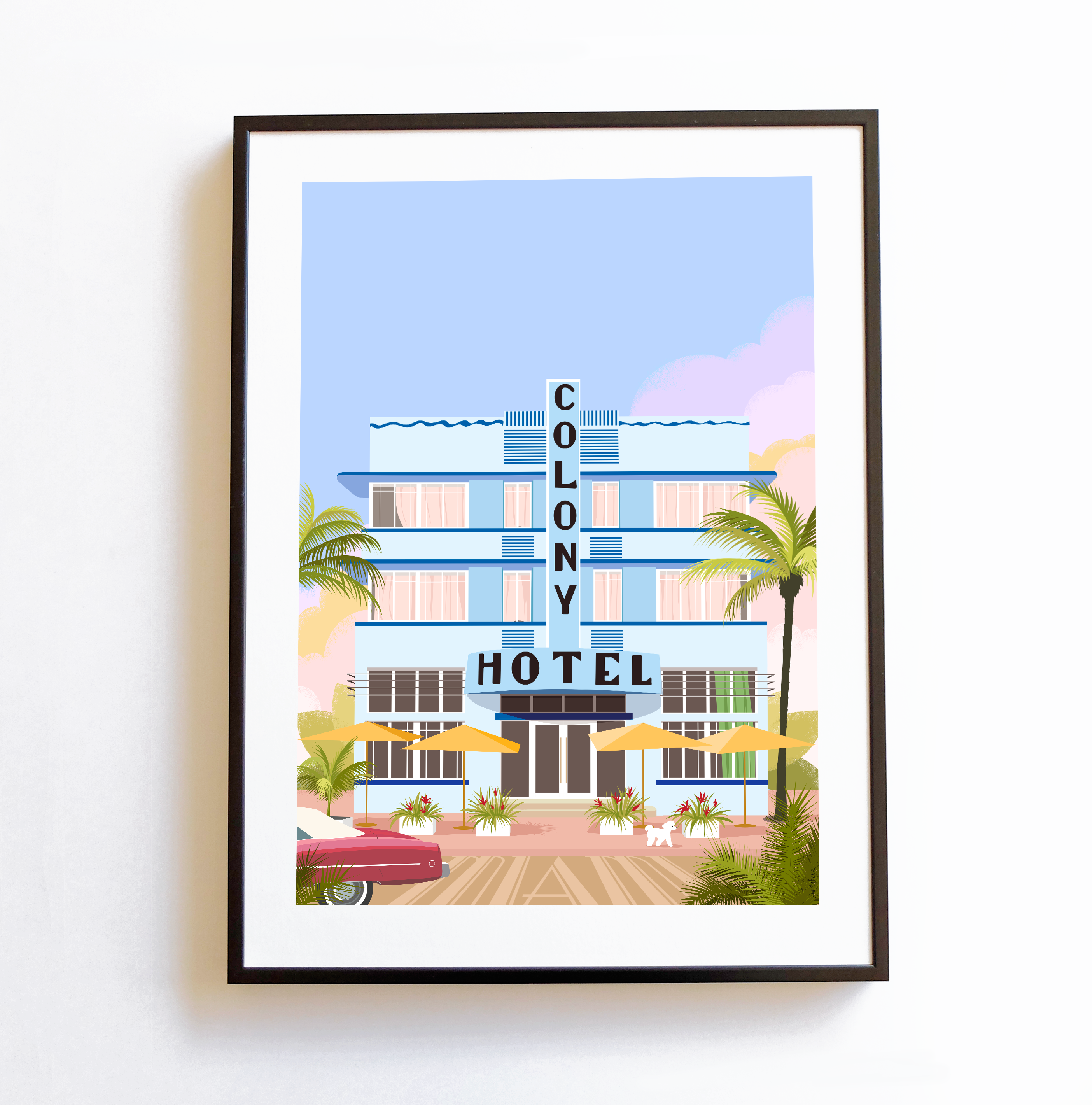 Poster Leslie Hotel Miami. Inkjet digital print on beautiful 210g Fine Art paper, thick and matte, very slightly textured, which respects the original colors perfectly. Size 30x40 cm with margin for framing. Limited edition, each print is dated and signed. Sold flat in a frameless plastic bag.