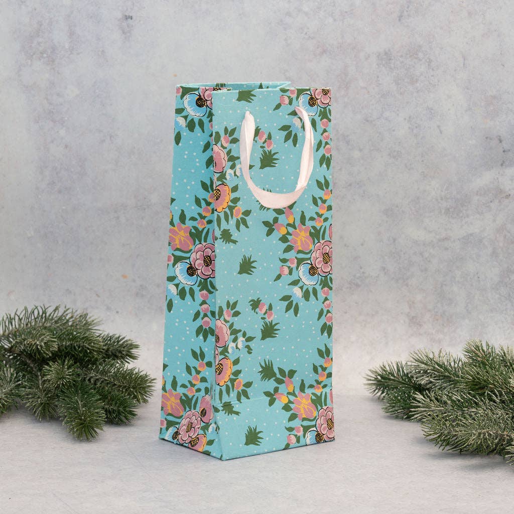 This premium Bottle Bag boasts a size of 33 x 13 x 10cm, elegant ribbon handles, and a luxurious 200gsm weight. The hand made paper is made from 100% Recycled cotton hoisery sourced from the Indian textile industry, it exudes exclusivity and sophistication. Enhance your gift with our gift wrap option, adorned with vibrant colors and metallic accents, hand screen printed using traditional techniques.