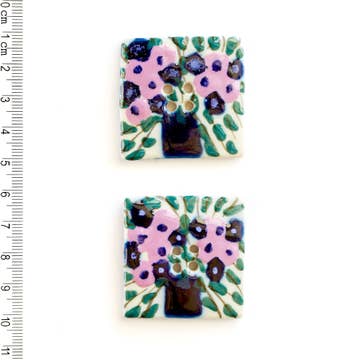 2 large square statement buttons. A beautiful hand-painted purple and pink floral on extra large square buttons. Size: In inches: Approximately 1.6 inches. In centimetres: Approximately 4cm. Handmade and painted in South Africa. Use our handmade buttons to replace plastic buttons or adorn a handmade item. Decorate a pocket, handbag, hat, sleeve, coat, apron, snood, beanie, shoes, make-up bag, cushion covers...the possibilities are endless. Flat backed and acid-free - perfect for use in paper-crafts: greeting cards, gift tags, scrapbooking. A card of Incomparable Buttons makes a unique and whimsical gift. 'Why settle for plastic?' Please note: all of our items are handmade and some slight variation in colour and size may occur. Our buttons are fully washable - we do recommend turning the garment inside-out before machine washing.