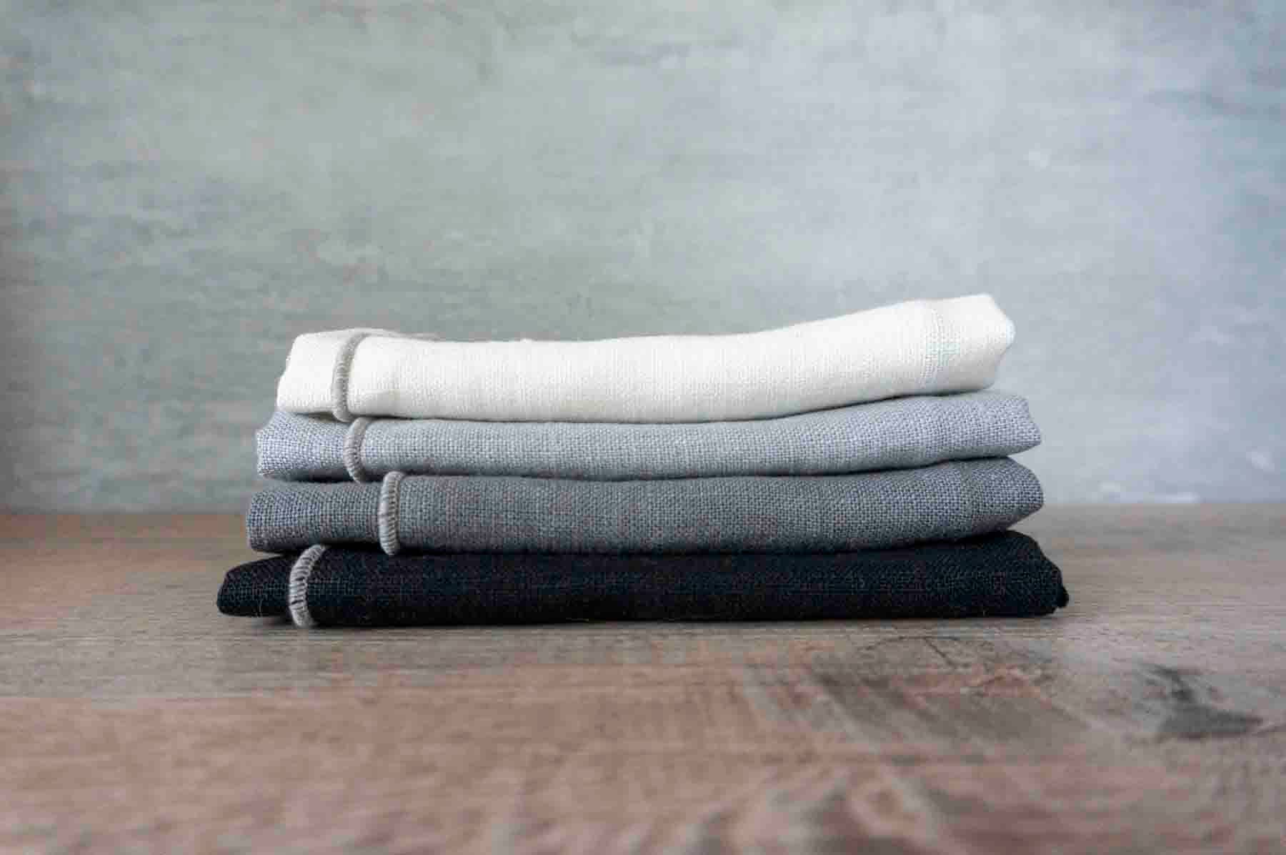 CURATED PACK OF 4 LINEN NAPKINS in the exclusive West Coast Handmade EVERGREEN MIX includes one fabric weight comprised of 4 colours lovingly brought together for maximum enjoyment: Natural Mixed- 180 gm/5.3 oz Crete – 150 gm/4.4 oz Spruce Green – 150 gm/4.4 oz Army Green - 200 gm/5.9 oz Trim Thread Color: Hunter Green Fabric Certification: OEKO-TEX 100 certified Packaging: Refer to attached images; note, belly band colours subject to change Each napkin measures between 15-16 in (38-41 cm) x 15-16 in (38-41 cm) squared. Since our items are handmade, cutting everything perfect and matchy-matchy every time just isn’t realistic. While we do the best we can to be as consistent as possible, we’ve come to accept our imperfections – which is kinda what makes our products genuine and is a solid reminder that our products are made by our own hands.