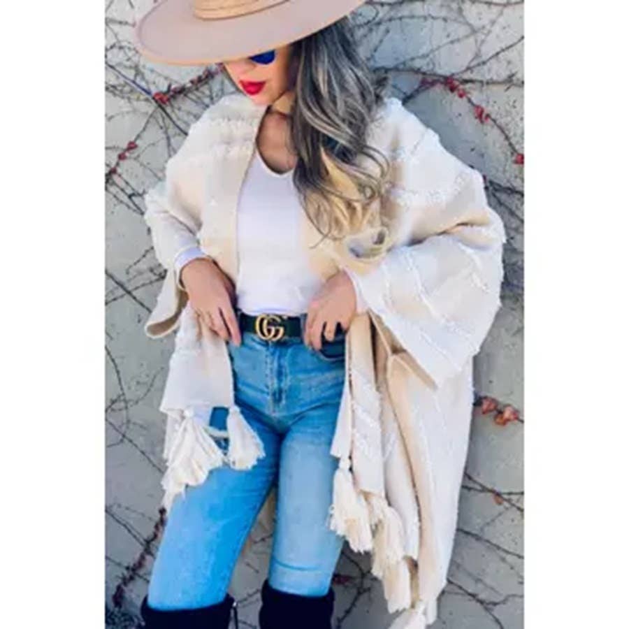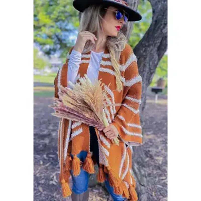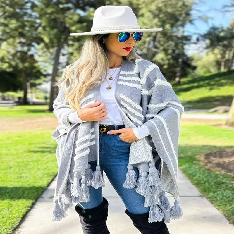 Colors : Cream Nude, Caramel, Grey Enhance your collection with our Grey Textured Knit Tassel Kimono Cardigan, a luxurious addition that combines elegance and comfort. This cardigan is expertly crafted from 100% acrylic, offering a soft and warm layer suitable for any season. It features a unique textured pattern inspired by Western aesthetics, and is adorned with chunky tassels for a sophisticated yet playful look. The open-front style and one-size-fits-most design up to 1XL ensure a versatile and flattering fit, making it an essential piece for any fashion-forward customer. Style: Open-front kimono cardigan with a relaxed, flowing silhouette, enhanced by a textured pattern and elegant tassels. Material: High-quality 100% acrylic, known for its durability and comfort. Color: Sophisticated grey, versatile and easy to style. Size: One size fits most, accommodating up to size 1XL, ensuring a comfortable and inclusive fit.