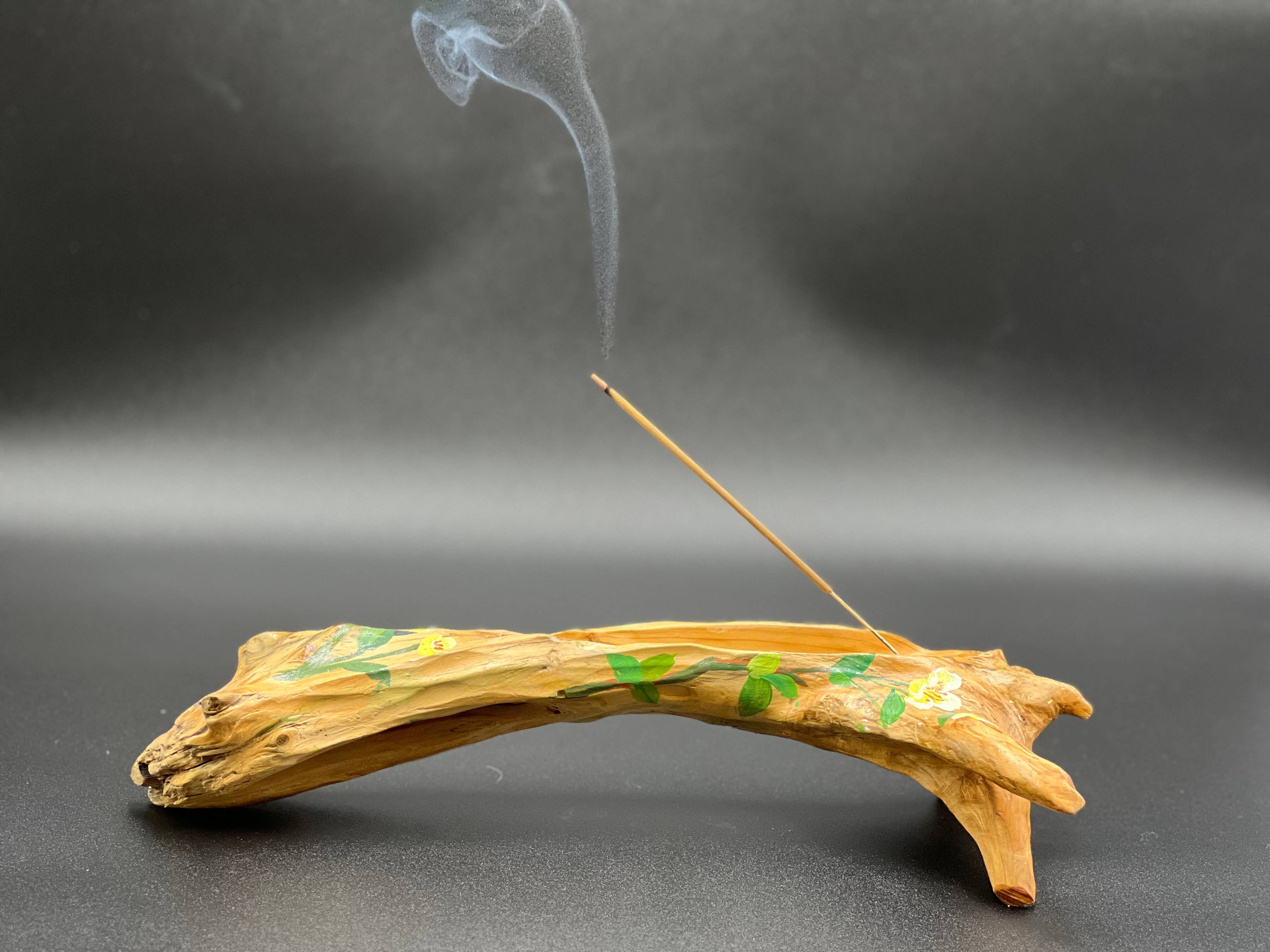 Each incense holder is hand carved from old dry thuja wood, which the artists then hand paint according to the grain and shape of the dry wood. Each incense holder is therefore unique and cannot be repeated. Dry wood symbolizes rebirth in Taoism