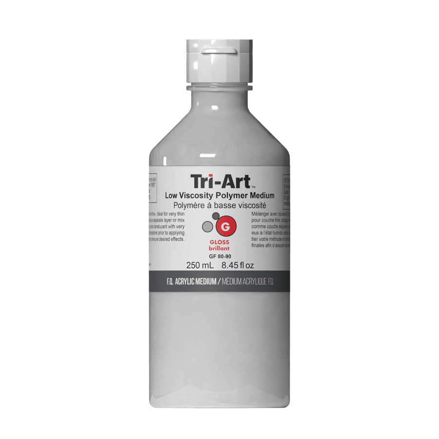 Low Viscosity Polymer Medium has a water-like consistency and dries to a permanent, flexible, glossy finish. It is the ultimate medium for producing thin, level layers and fine-detail brush work. It can be tinted in any proportion with High Viscosity Liquid Acrylics or Acrylic Inks to produce luminous glazes or reduce the paint's viscosity. https://www.tri-art.ca/wp-content/uploads/2020/09/mediums_swatch_chart_digital.pdf